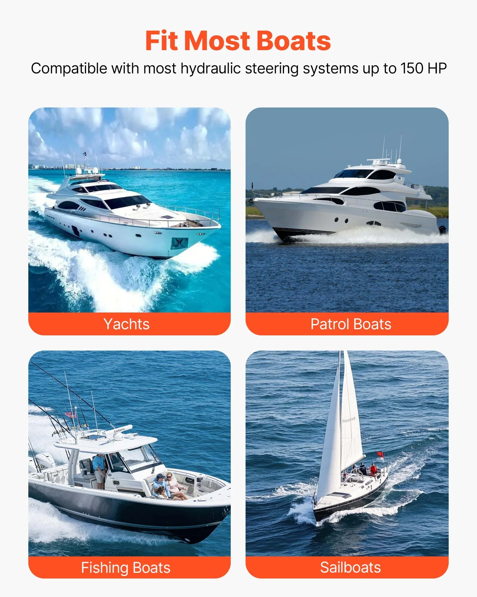 The boat hydraulic steering system includes a space-saving cylinder that fits a variety of boat types. Its reinforced sealing structure ensures smooth steering performance and durability even in rough marine conditions