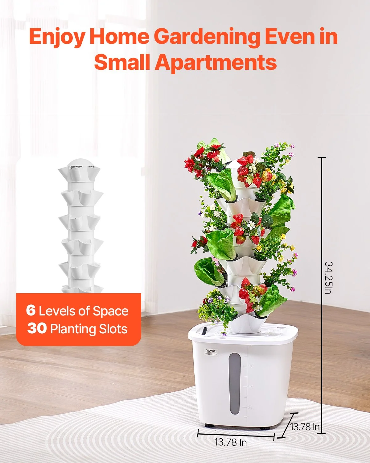 Featuring a 6-tier vertical design with 30 planting pods, this hydroponic tower measures just 13.78 x 13.78 x 34.25 inches. Ideal for kitchens, balconies, and small apartments, it maximizes space and allows you to grow efficiently while enjoying a green lifestyle.
