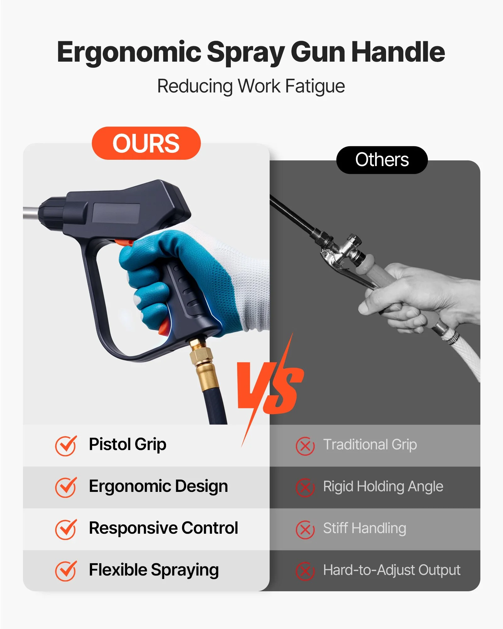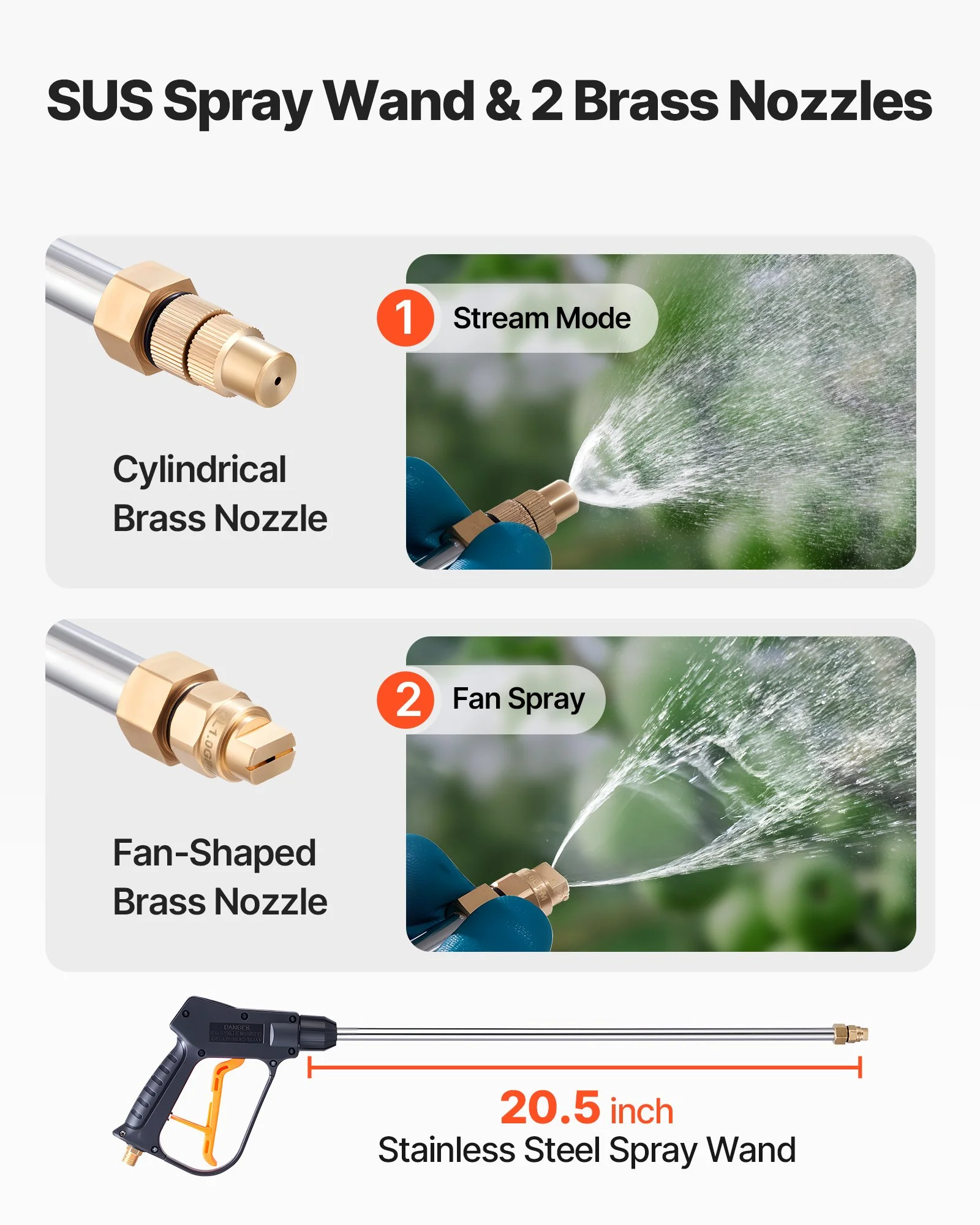 The steel hand pump sprayer features pistol grip design that reduces arm fatigue, while the 24-inch brass spray wand ensures precise spraying, enhancing comfort and spraying efficiency.