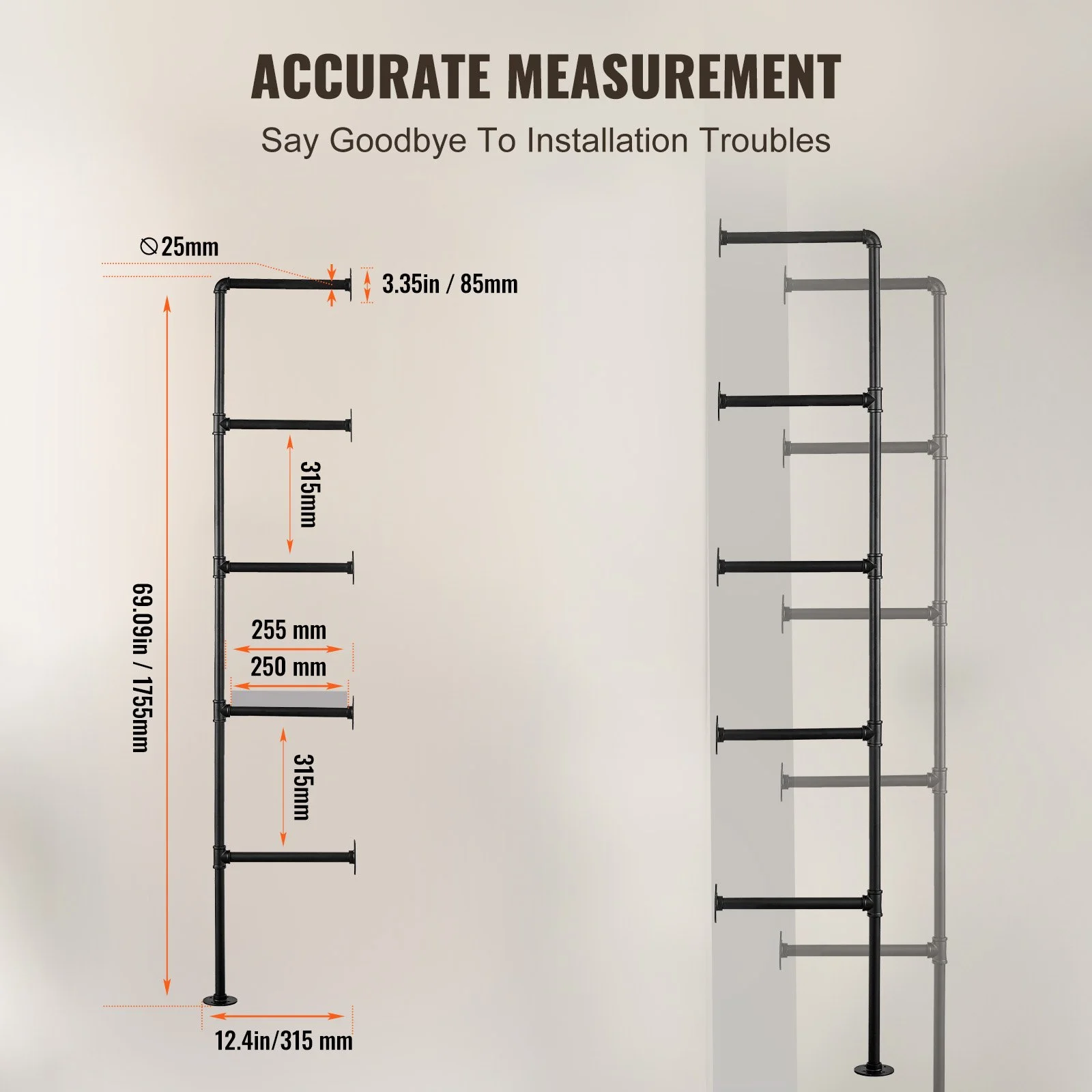 our metal pipe shelves are 69" in height and 12.4” in height per tier, you can measure whether the installation position is suitable before purchasing.
