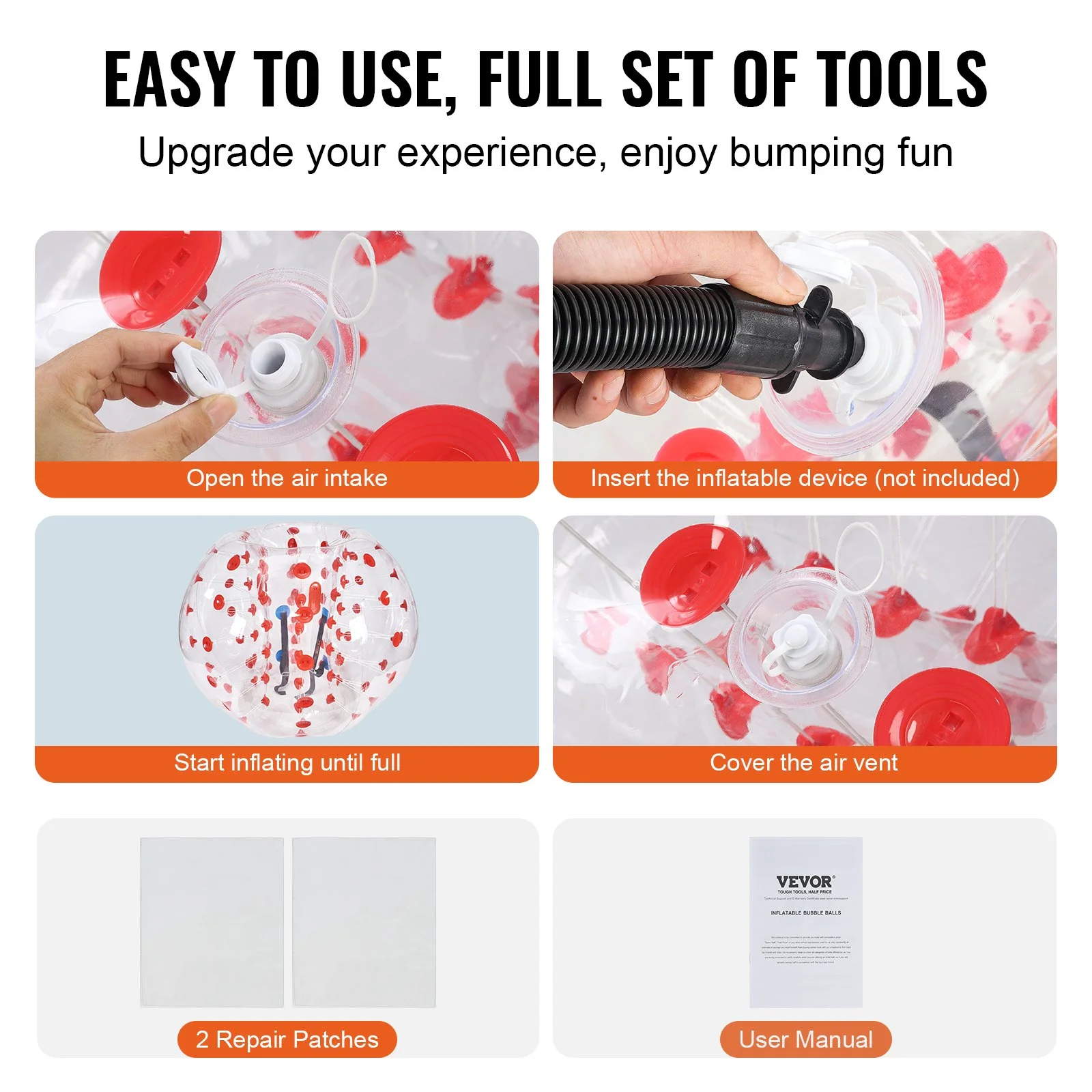 VEVOR human hamster bubble balls are suitable for solo or group entertainment, enjoy the freedom of bouncing, bopping, and bumping with friends. It is ideal for gardens, backyards, playgrounds, parks, recreation centers, enjoying bumping fun anytime, anywhere.