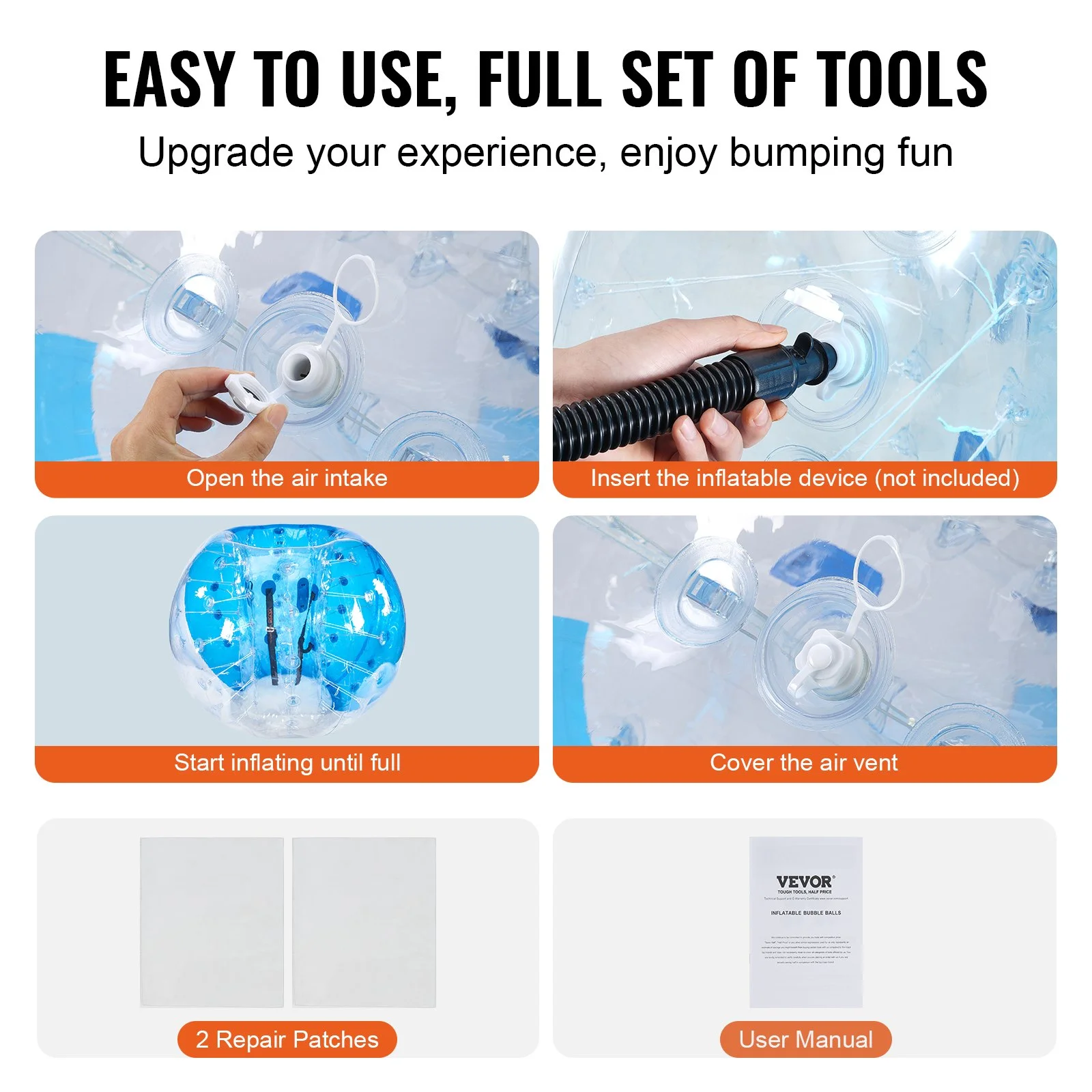 VEVOR human hamster bubble balls are suitable for solo or group entertainment, enjoy the freedom of bouncing, bopping, and bumping with friends. It is ideal for gardens, backyards, playgrounds, parks, recreation centers, enjoying bumping fun anytime, anywhere.