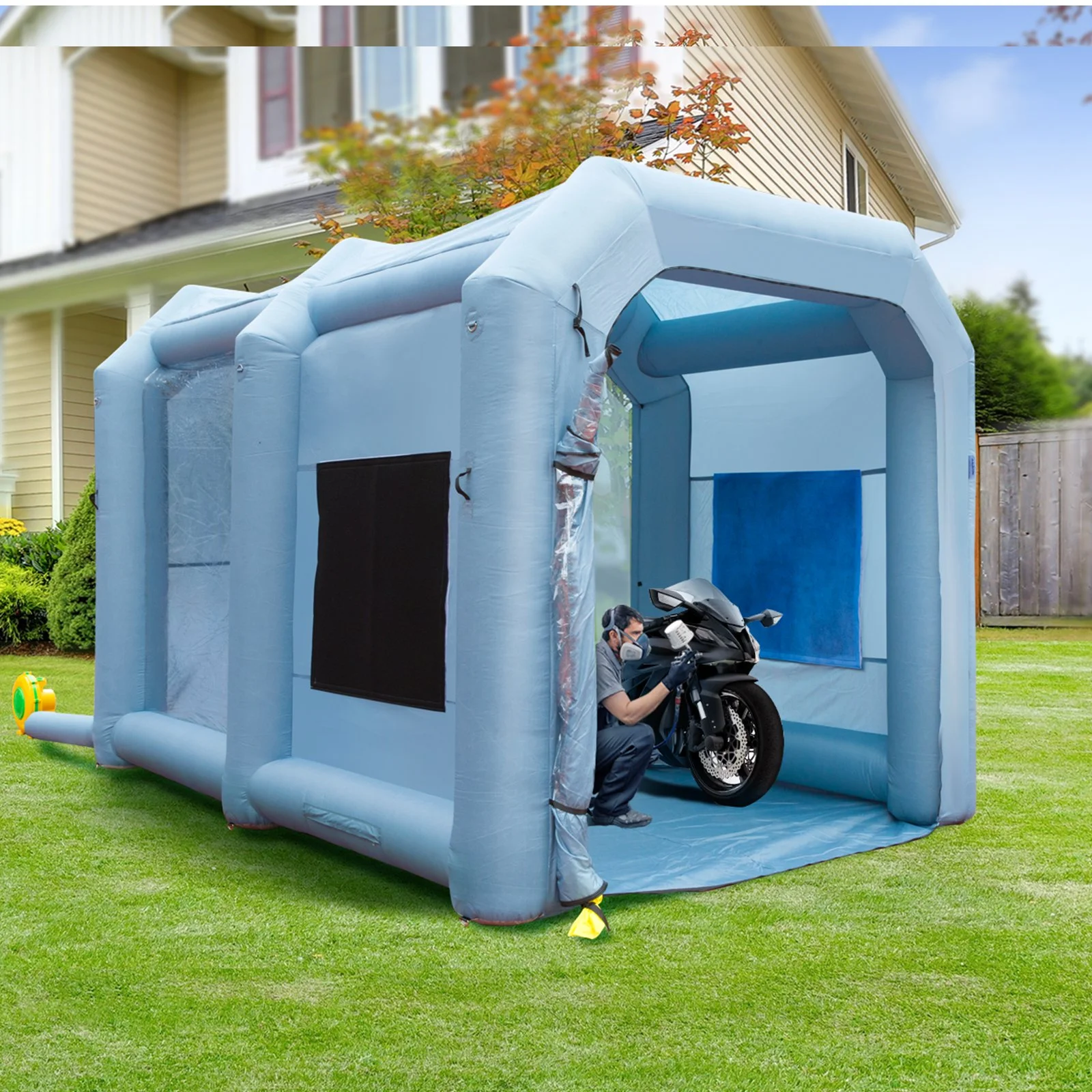 With sturdy stakes and ropes included, this spray paint tent can be easily fixed to the ground. Whether you're using it in your garage, driveway, lawn, or even indoors, you can count on our product to stay in place. Upgraded tank zipper and double fabric stitching make the whole tent stable and do not shake during using. NOTE: It is NOT recommended for use in rainy weather. The blower needs to keep running, and venting of stitches is normal!