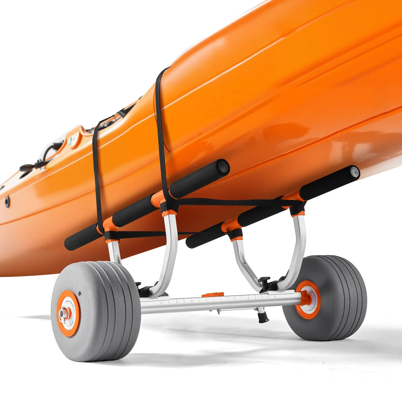 Equipped with 12-inch inflatable PU wheels and 6.3-inch wide tires, this kayak roller cart easily glides over sand, boardwalk docks, and grass. Also, comes with dual air nozzles for easy use