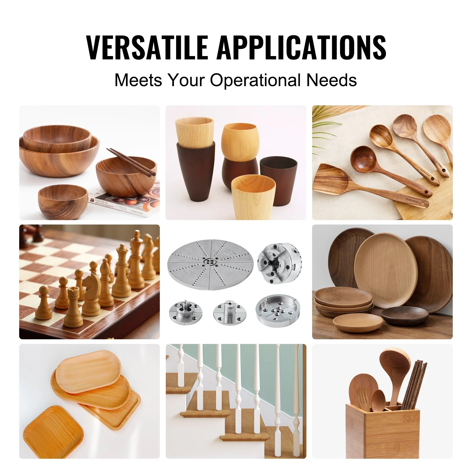 This comprehensive lathe chuck set includes dovetail jaws, round jaws, flat jaws, step jaws, and taper jaws – a total of 5 different types of jaws along with the necessary installation tools. From slender items like pen blanks to larger items such as plates and bowls, this assortment of jaws enables a variety of clamping options, providing you with greater flexibility.