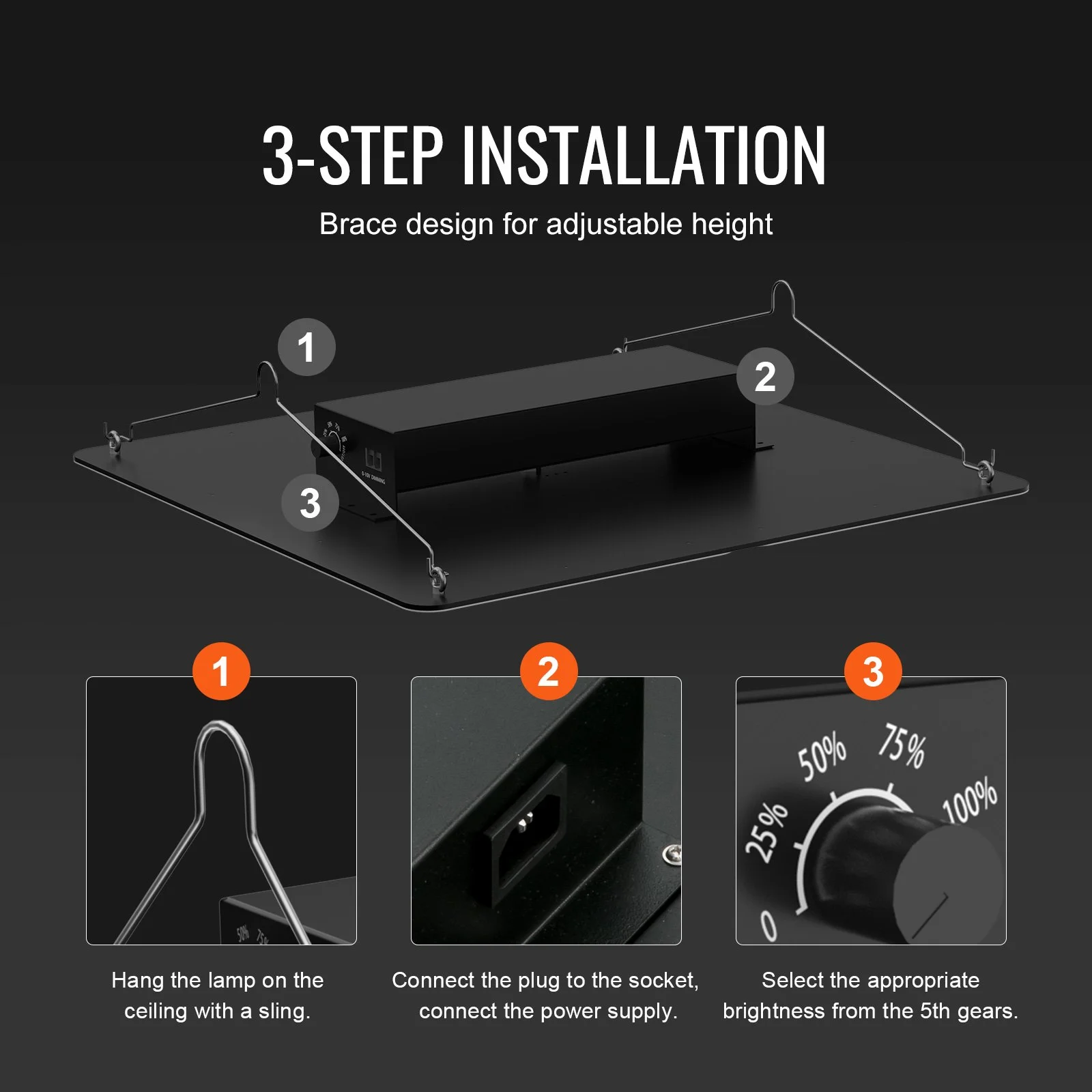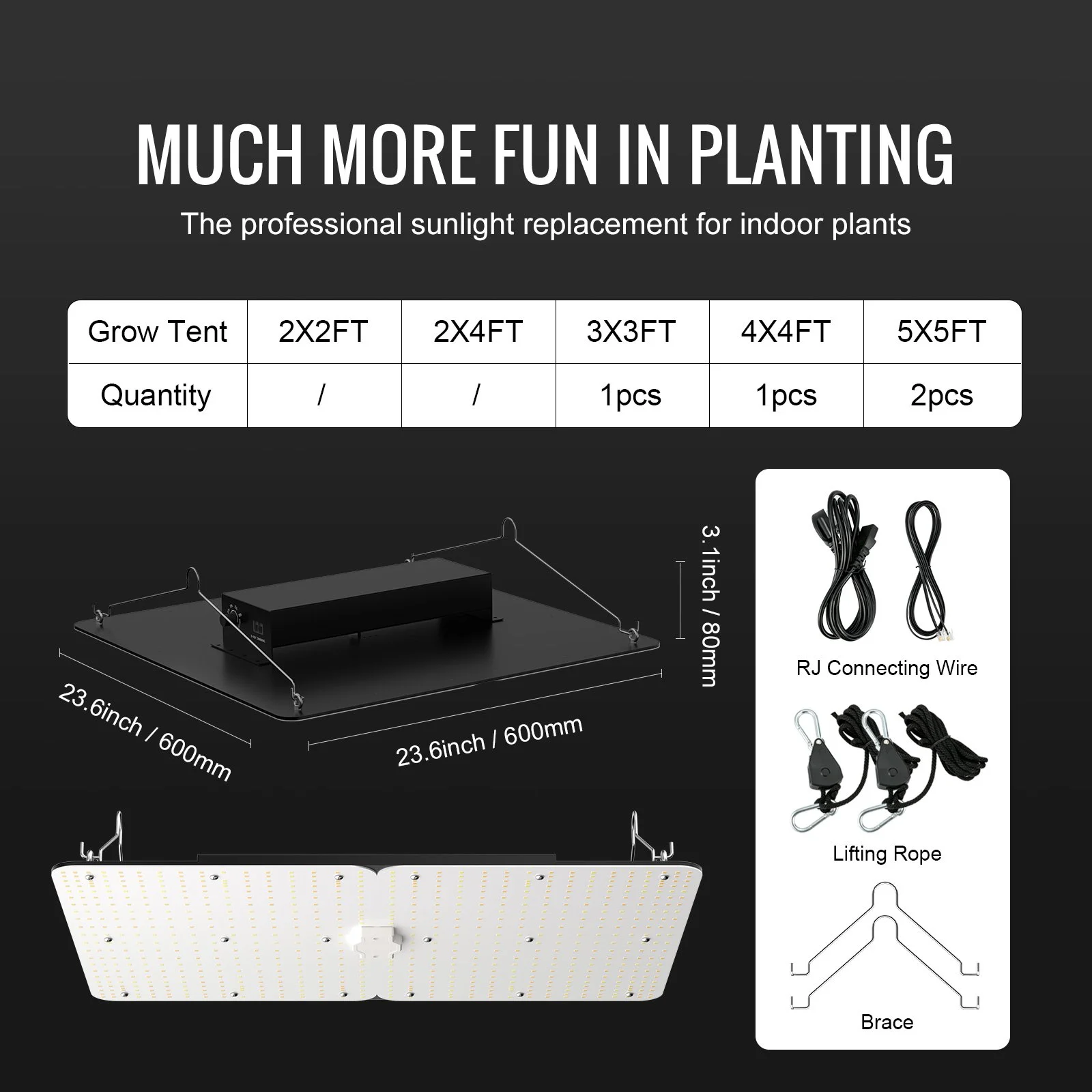 Our growing light is designed with a stay bar, and the height can be adjusted at will, making it stable and flexible to install. With five brightness gears, you can adjust the light intensity freely. The multi-light connection with unified dimming is especially beneficial for large indoor growing and commercial planting, allowing you to take control of any space.
