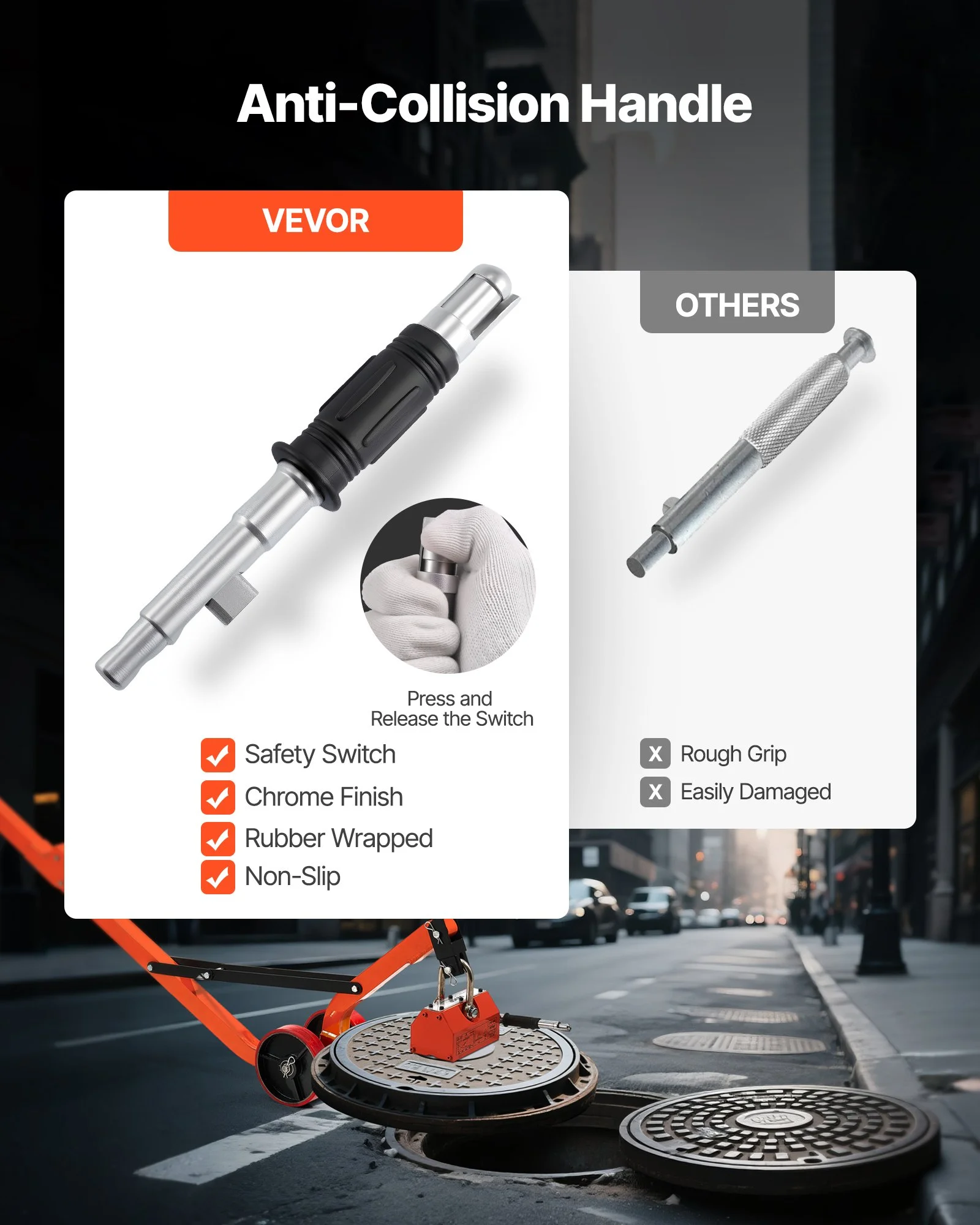The manhole cover lifter features a chrome-plated handle with a built-in security button. The handle only rotates when the button is pressed, helping avoid accidental activation. Rubber wrapping ensures a comfortable grip