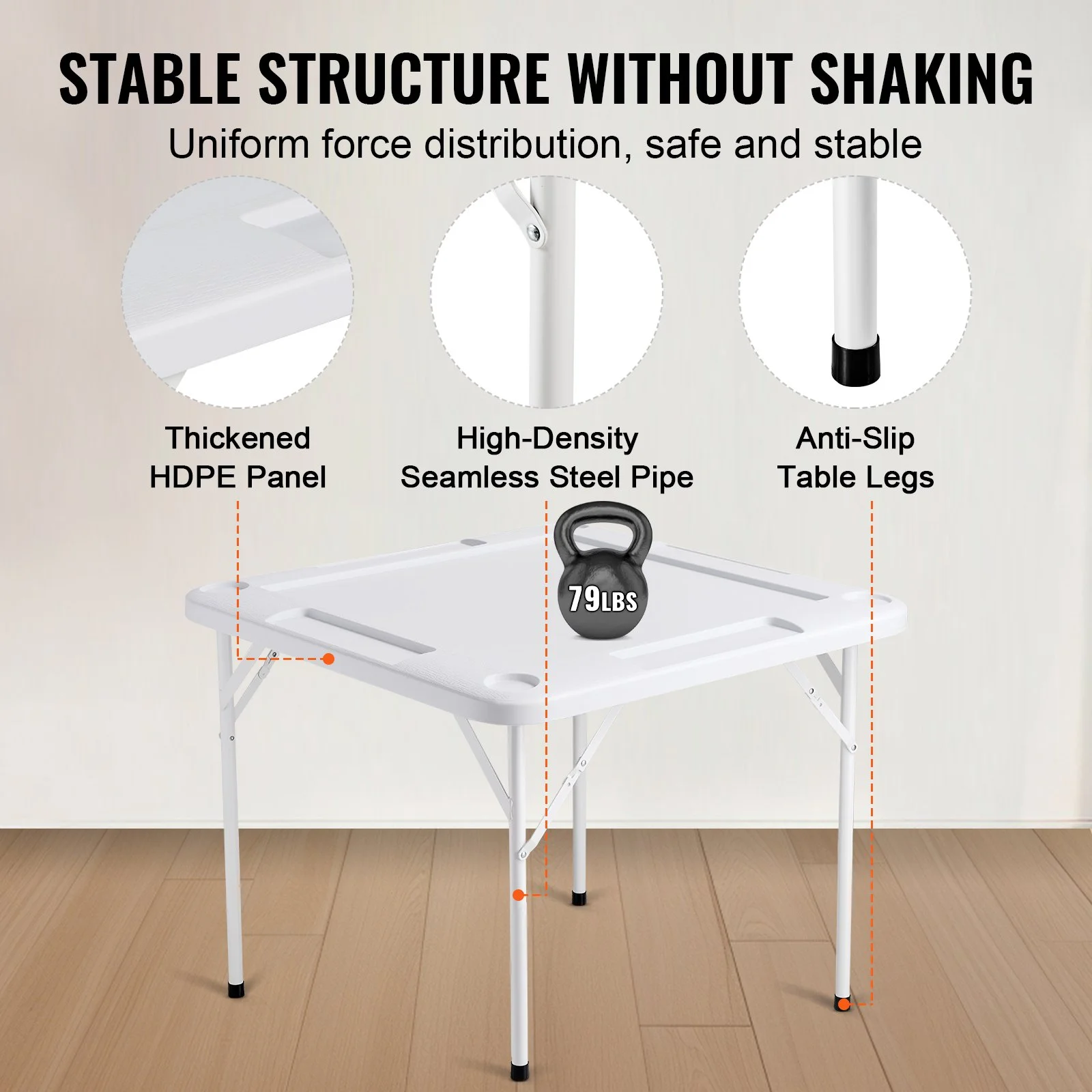 Our 4-player folding card table-top is made of high density polyethylene(HDPE), durable and waterproof. Its high-density seamless steel pipe is rust-resistant, while the non-slip foot pads enhance stability, reduce noise, and resist wear. With outstanding load-bearing capacity, it provides excellent stability during playtime.