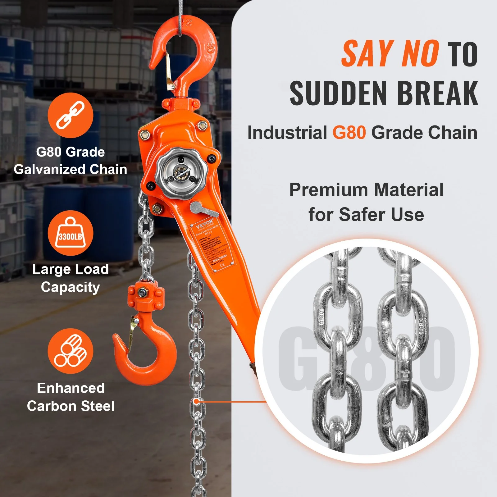 The lifting chain is made of G80 galvanized manganese steel and has high strength and toughness. When working in harsh environments, the galvanized layer can provide corrosion resistance.