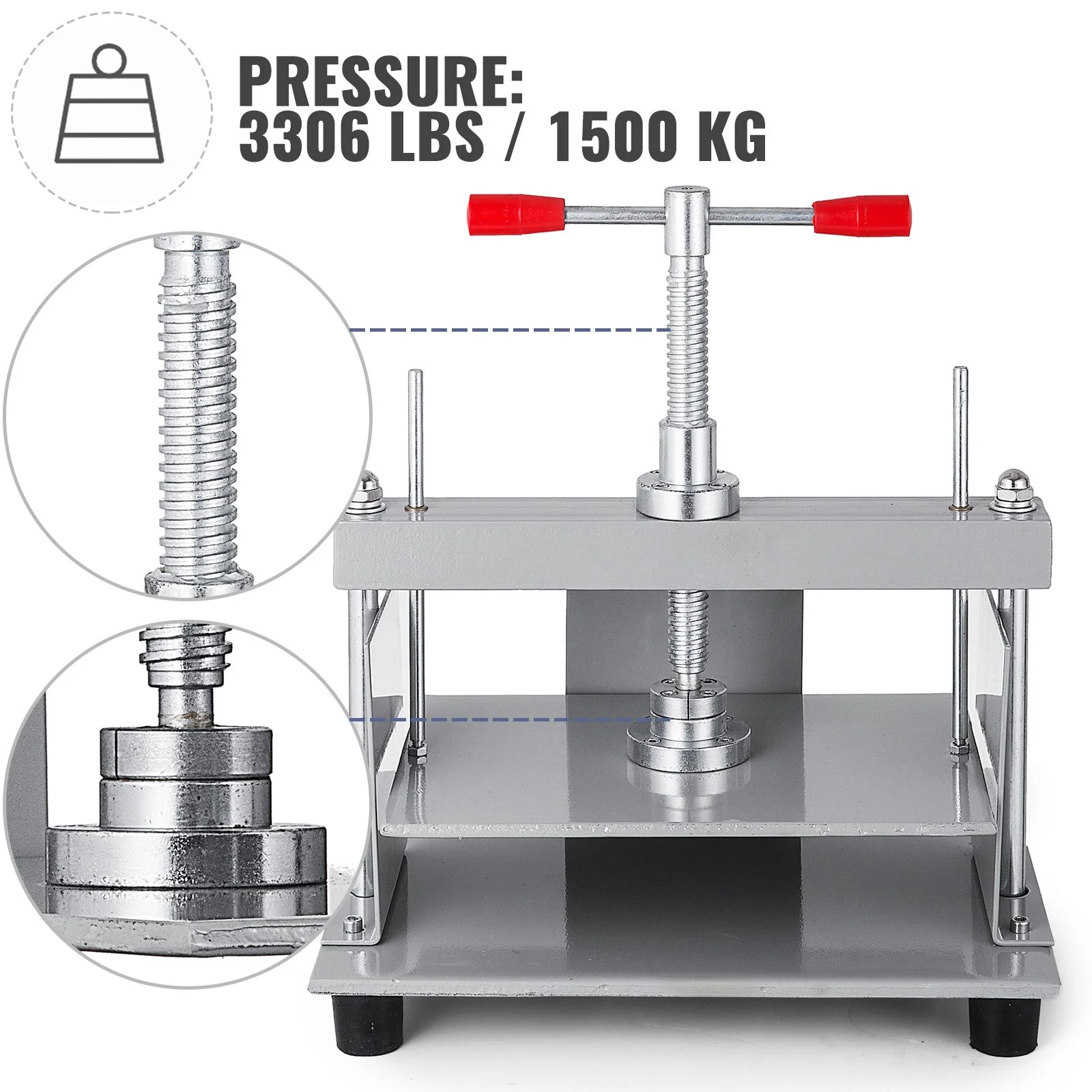Our powerful paper flattener is commonly suitable for A4 sized paper. It's obvious to perceive that your documents can be flattened more efficiently by 12" x 8.7"/305 x 220 mm large working area and 5.9"/150 mm flattening thickness. With the rotary handle, elongated nut, bold screw rod, and thickened plate, the pressure can reach 3306 lbs /1500 KG.