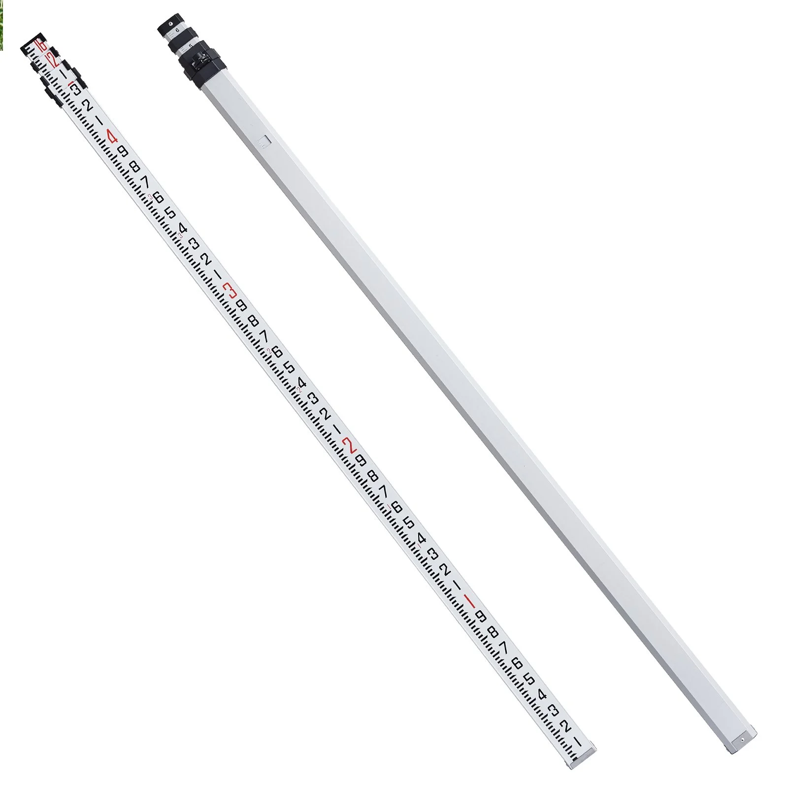 This leveling rod is equipped with 4 adjustable telescopic sections, extending up to 16ft/4.88m. Designed in a rectangular shape, it ensures ease of operation and alignment with surfaces, collapsing for compact storage when not in use.