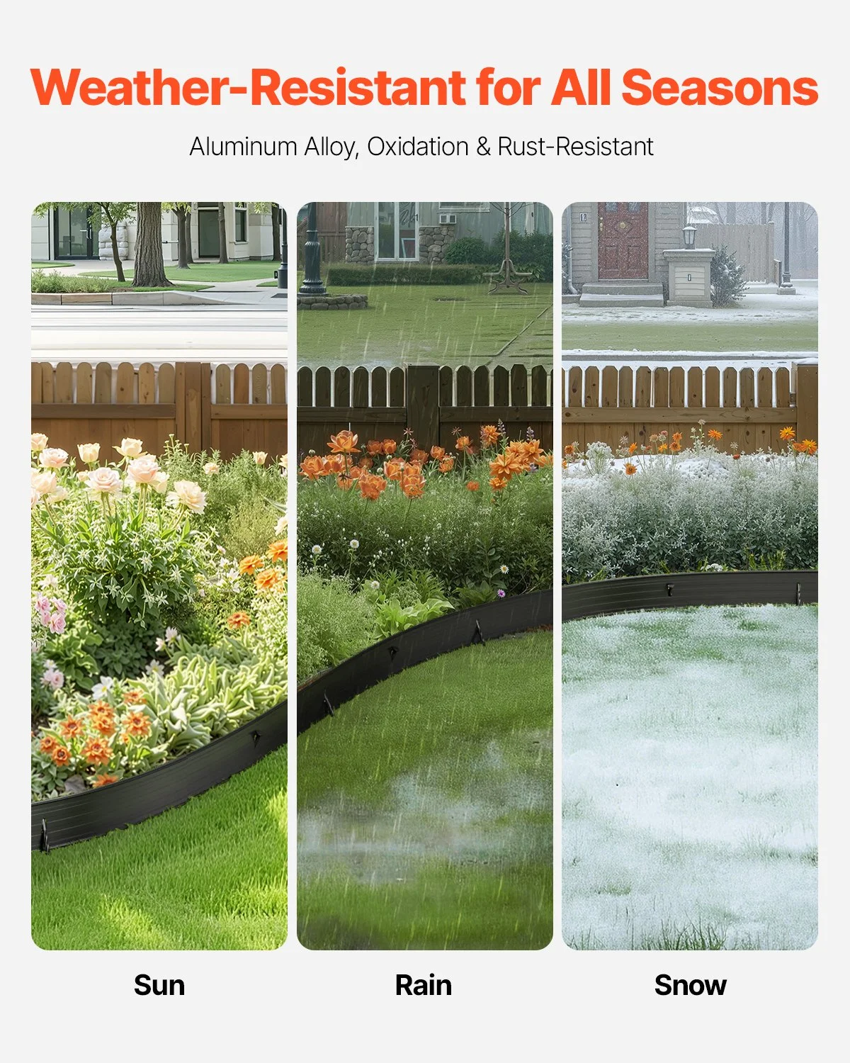 Constructed from high-quality aluminum alloy with a powder-coated, rust-resistant finish, this metal landscape edging stands up to harsh weather conditions. It resists fading, cracking, and rusting, making it ideal all-weather outdoor use.
