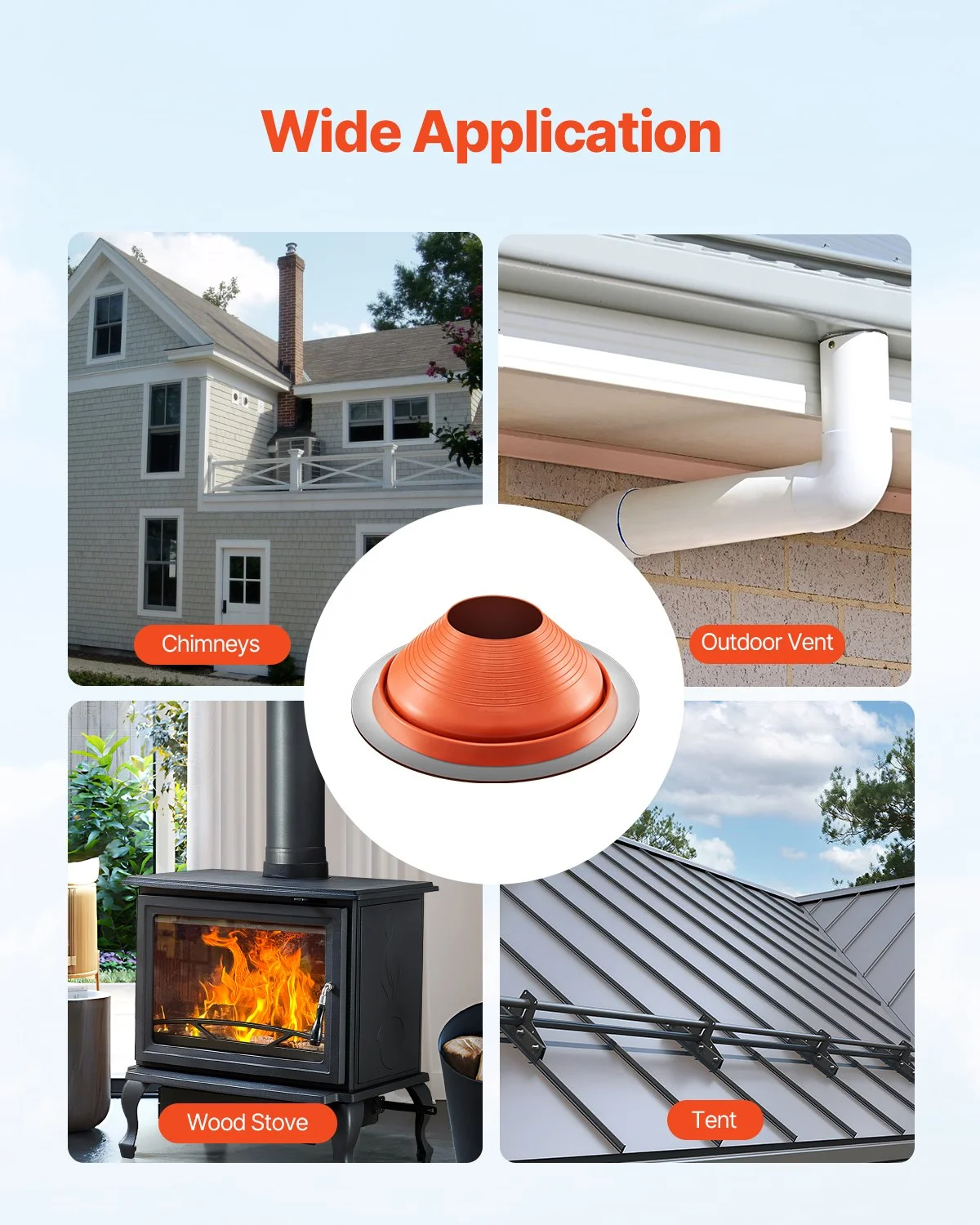 This flashing boot is suitable for roofs made of metal, wood, and other materials. It is also widely used for chimneys, vents, wood stoves, pipe openings, and tent pipes, offering versatile and reliable protection. Note: Do not use consistently in applications exceeding the temperature range. High-quality sealant is recommended to avoid aging or cracking, which could lead to water leaks.