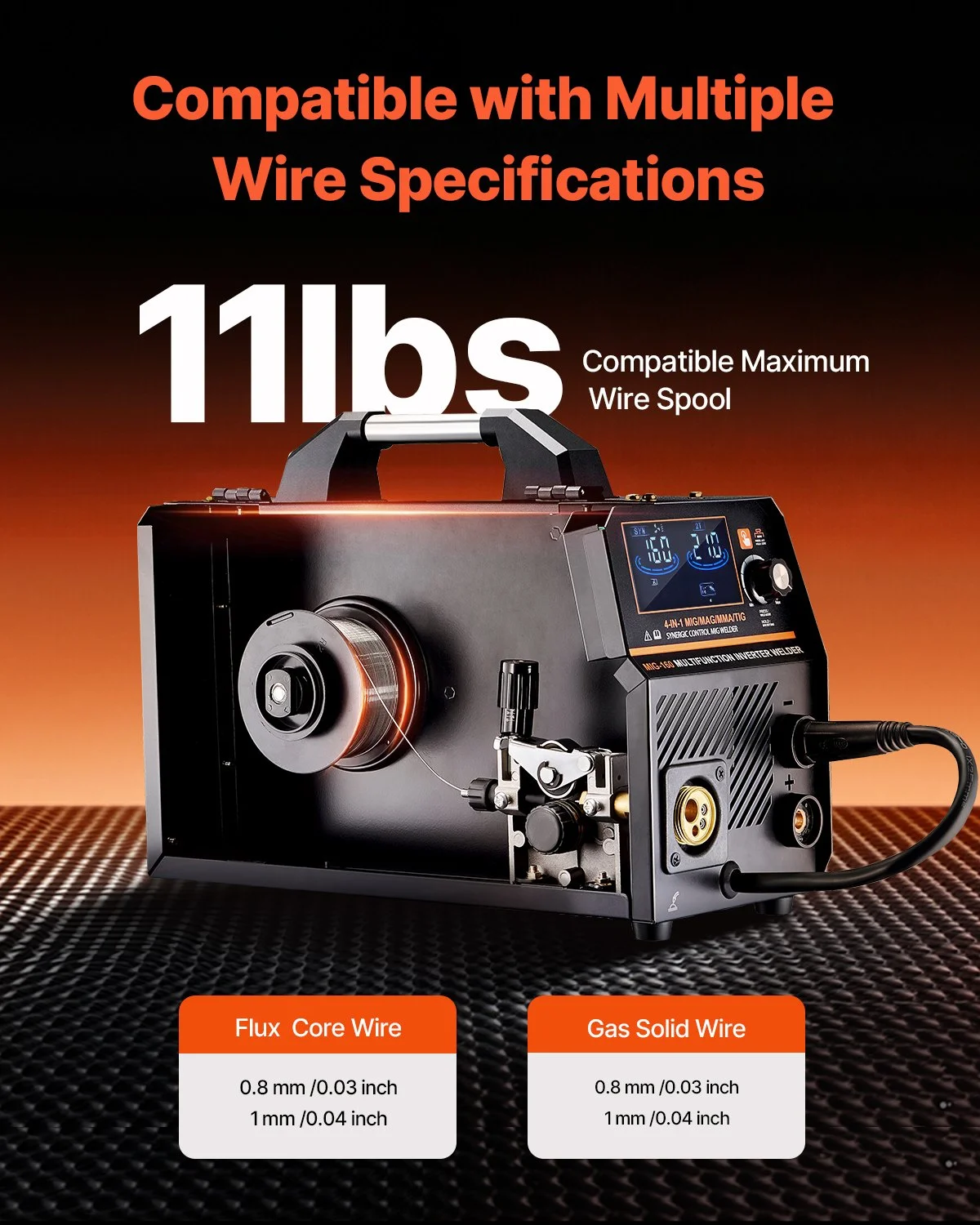 Our mig welding machine is compatible with flux core wire and gas solid wire, with a maximum wire capacity of 11 lbs (5 kg). Suitable for 0.03" (0.8mm) & 0.04" (1.0mm) flux core and solid core wire, meeting the needs of different welding tasks. NOTE: This product is suitable for ≥15A Socket