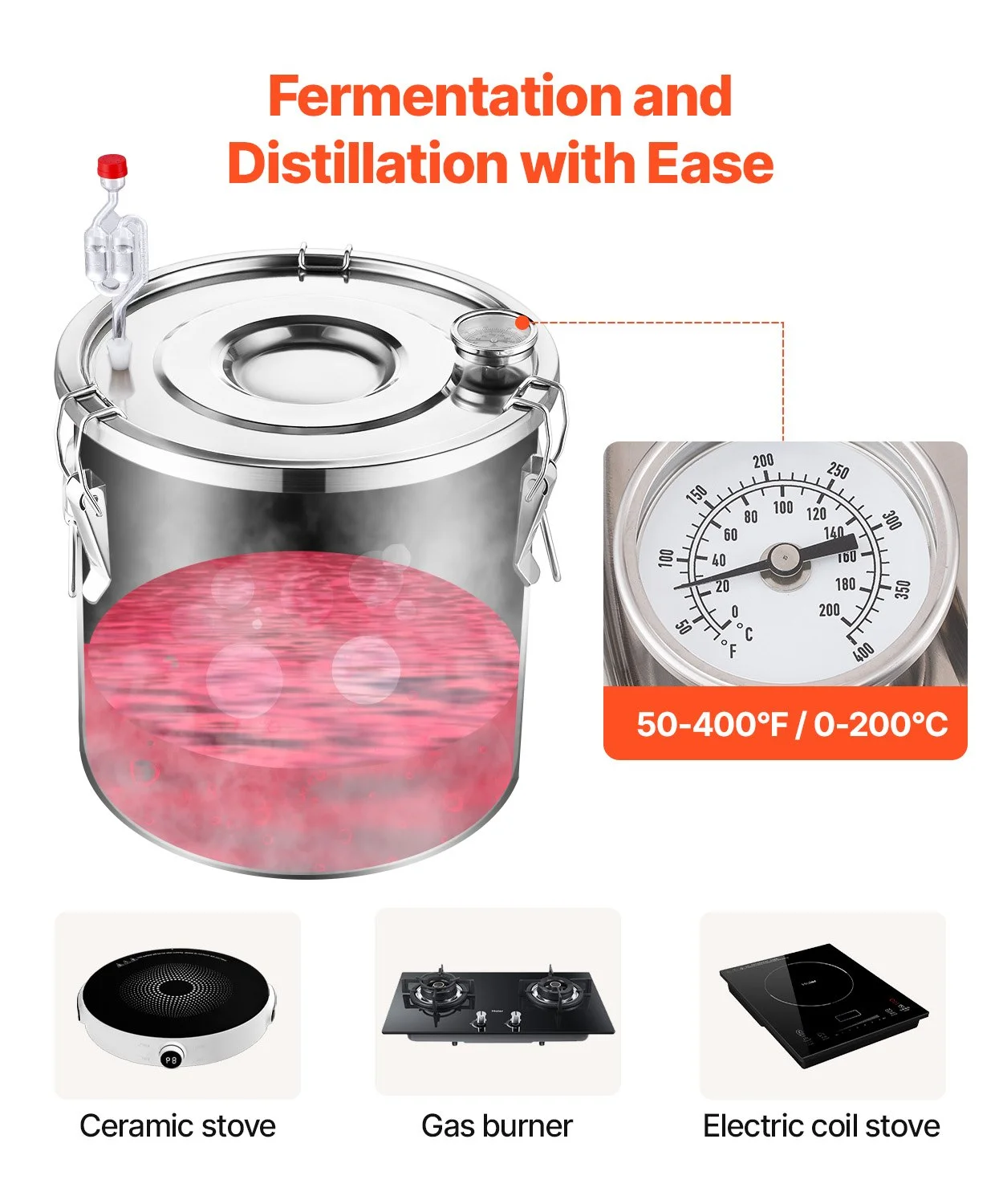 The fermentation barrel is convenient to use. A unidirectional exhaust valve releases gases produced during fermentation, reducing internal pressure. The thickened stainless steel bottom is compatible with various heating methods such as wood fire, gas stoves, and gas stoves, preventing deformation and damage. The temperature gauge on the lid displays Celsius and Fahrenheit temperatures, facilitating temperature monitoring during distillation.