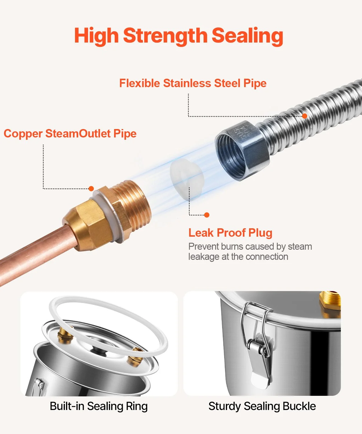 Silicone leak-proof plugs are added at the corrugated pipe joints to prevent leaks of water vapor, reducing the risk of burns and other injuries. Use a wrench to tighten connections securely during assembly. The fermentation barrel lid features four fixed sealing latches with built-in seals, ensuring hygiene and optimal fermentation results.