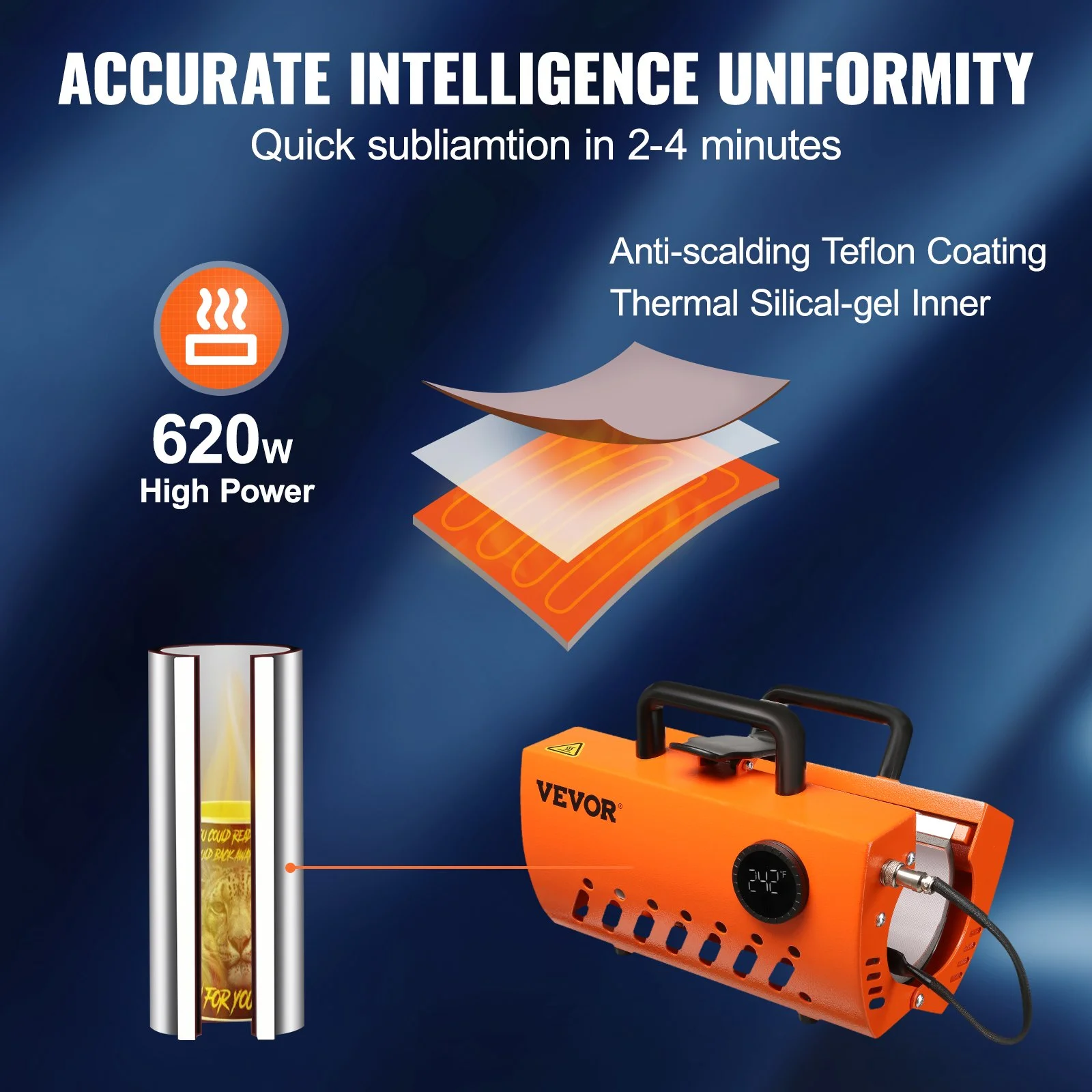 Our 620W heating element, adopted in silica-gel and iron, delivers a faster heating speed and a better transfer effect. A soft silica-gel heating liner is applied to wrap mugs and reduces unpleasant smells. Perfect for cups made from ceramics, stainless steel, glasses, and so on. Time Range: 0-999s. Temperature Range: 0-410��F / 210��C.