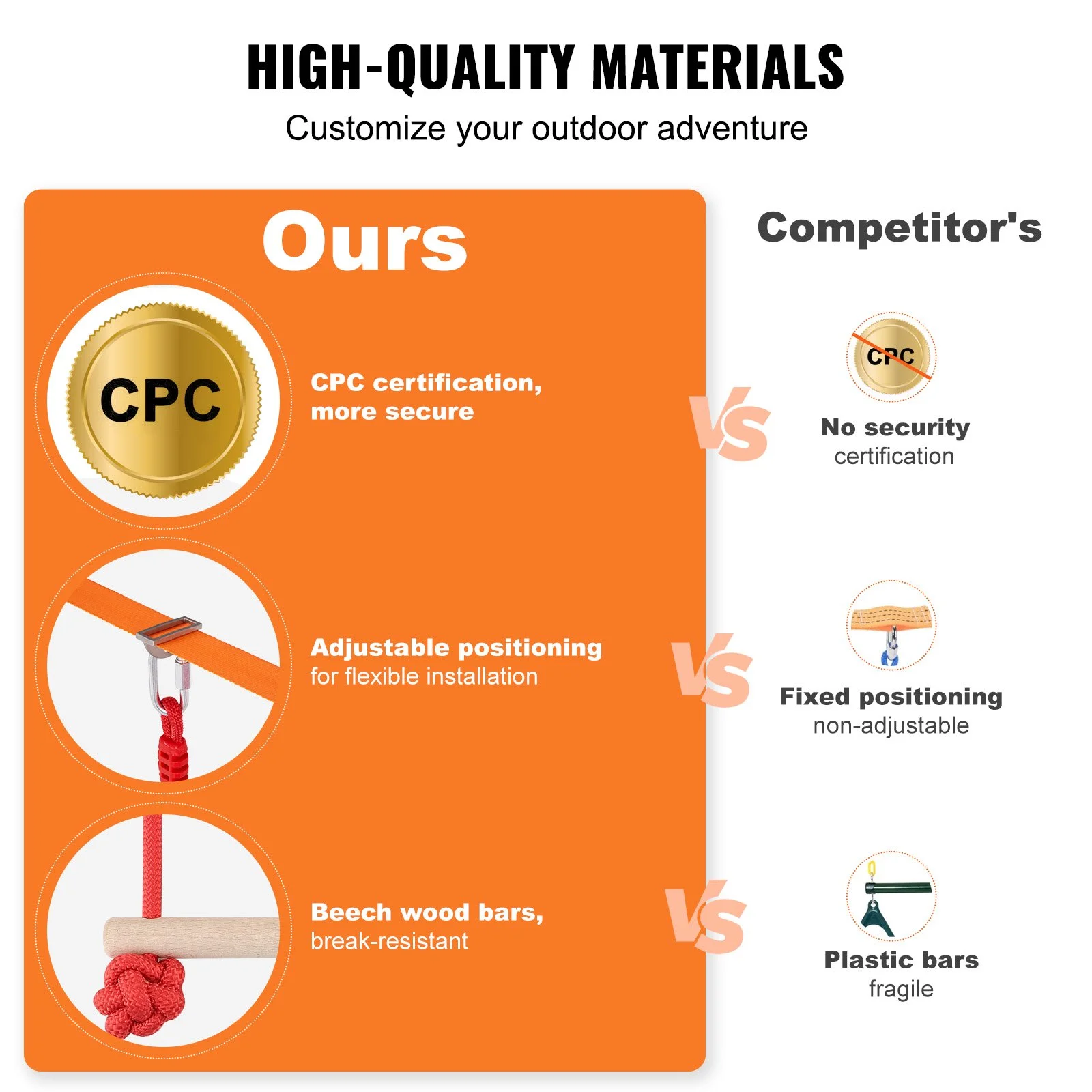 Each backyard training equipment set can support up to 500 pounds, sufficient for two or more children to use simultaneously. The upgraded die-cast buckle straps, tensioners, and wider, thicker straps solve the issue of sagging ropes, securely locking onto trees to ensure children's feet don’t touch the ground for a worry-free play experience. The double-layer thermoplastic straps ensure the product doesn’t crack, providing a safe and sufficient gripping experience for children.