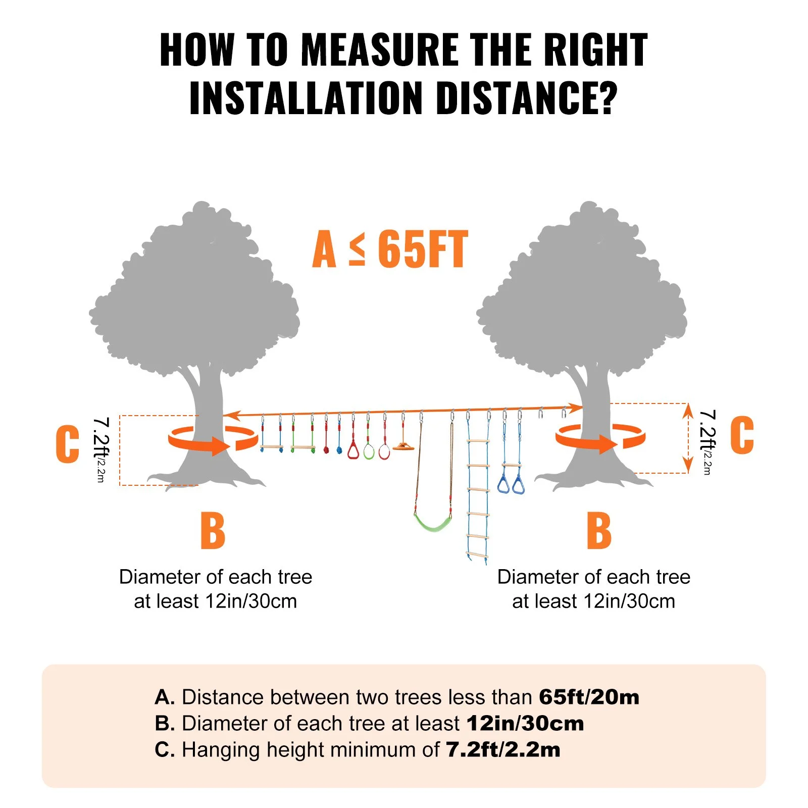 The outdoor playset equipment can be assembled in just 5 minutes. There's no need for a wide flat area in your yard; just fix it between two trees or poles 20 to 40 feet apart to start customizing your obstacle challenge game! It's an ideal alternative to traditional playgrounds, offering a convenient and flexible backyard challenge game for children of various ages and skill levels.