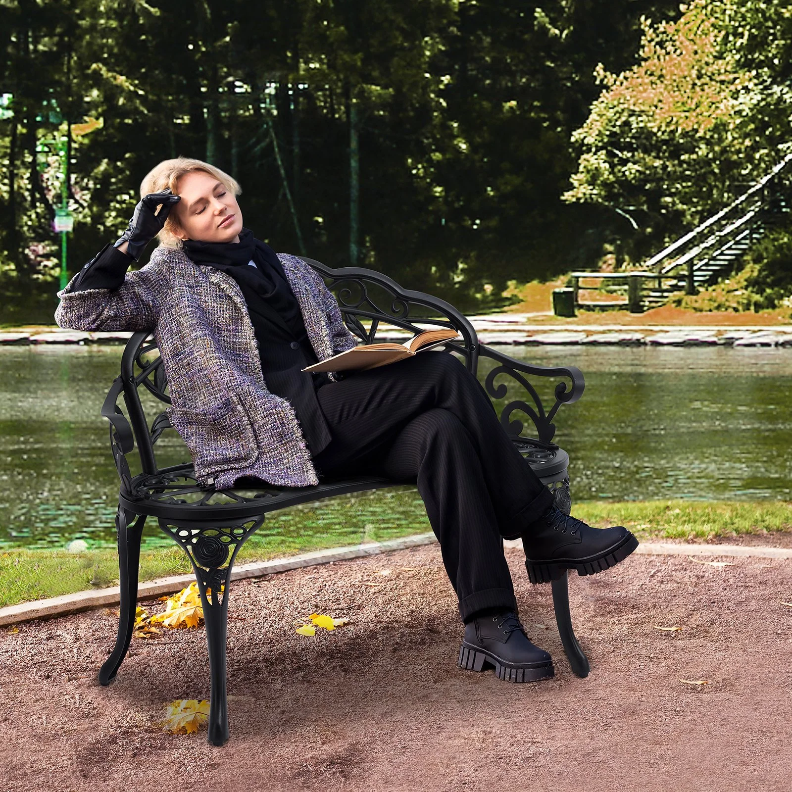 This outdoor bench features a high-quality metal frame with a waterproof powder coating, ensuring durability in various weather conditions. It resists corrosion, deformation, and damage, supporting up to 480 lbs/218kg to accommodate users of different sizes.