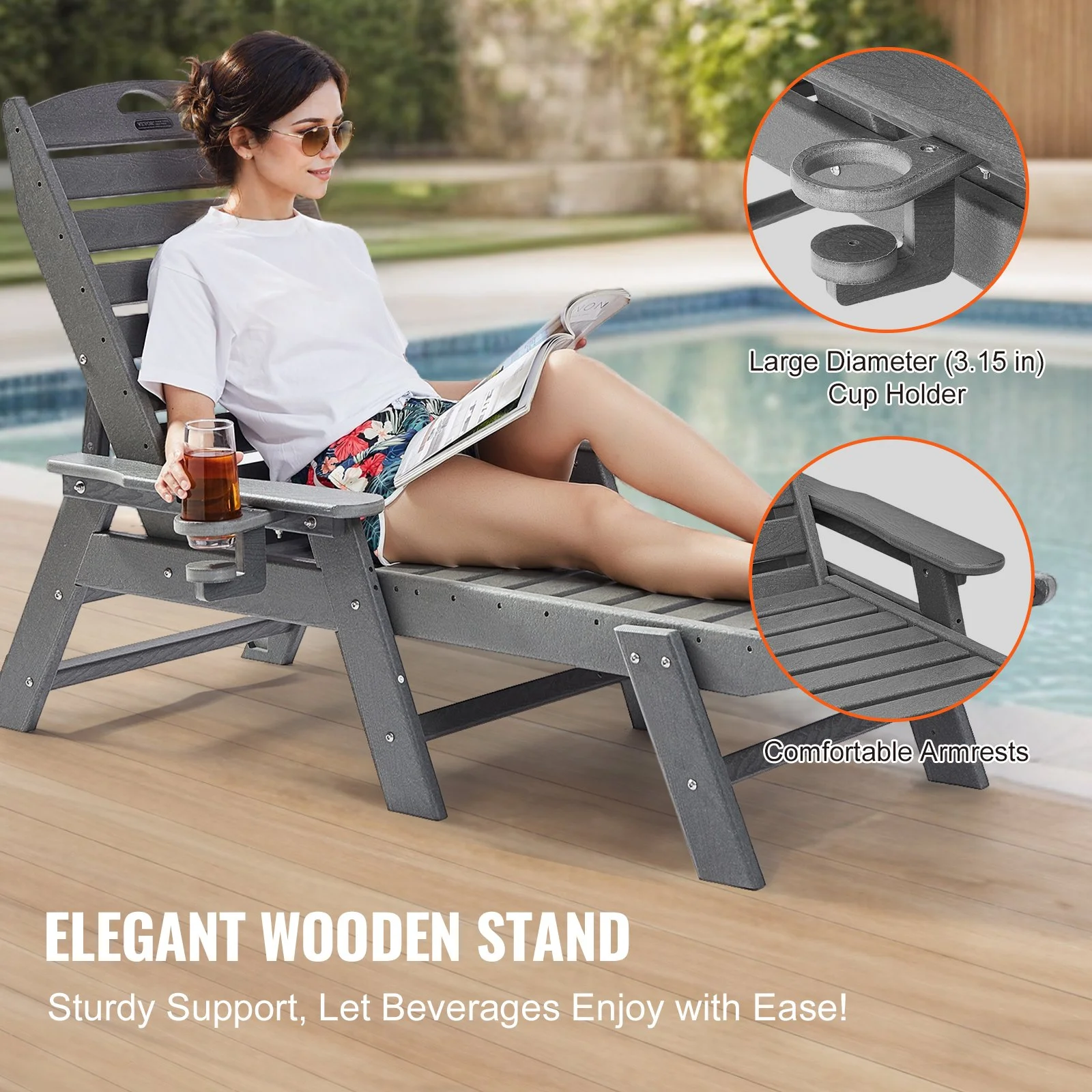 Constructed with thick HDPE material and a robust triangular support structure, the outdoor lounge chair offers superior stability and durability. Supporting up to 400 lbs (181 kg), it ensures a secure relaxation experience.