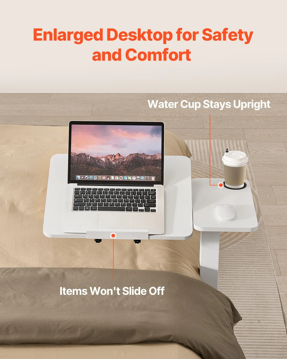 The large surface provides plenty of space for your laptop, books, and other essentials. The anti-slip edge keeps your items from sliding off, and the cup holder ensures your drinks stay secure.