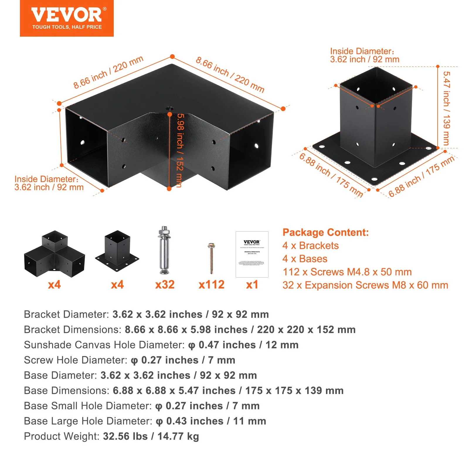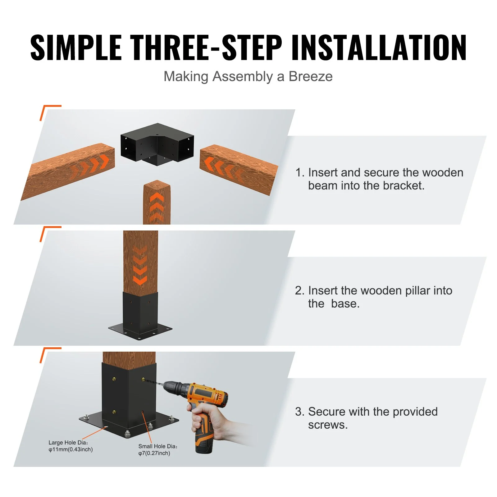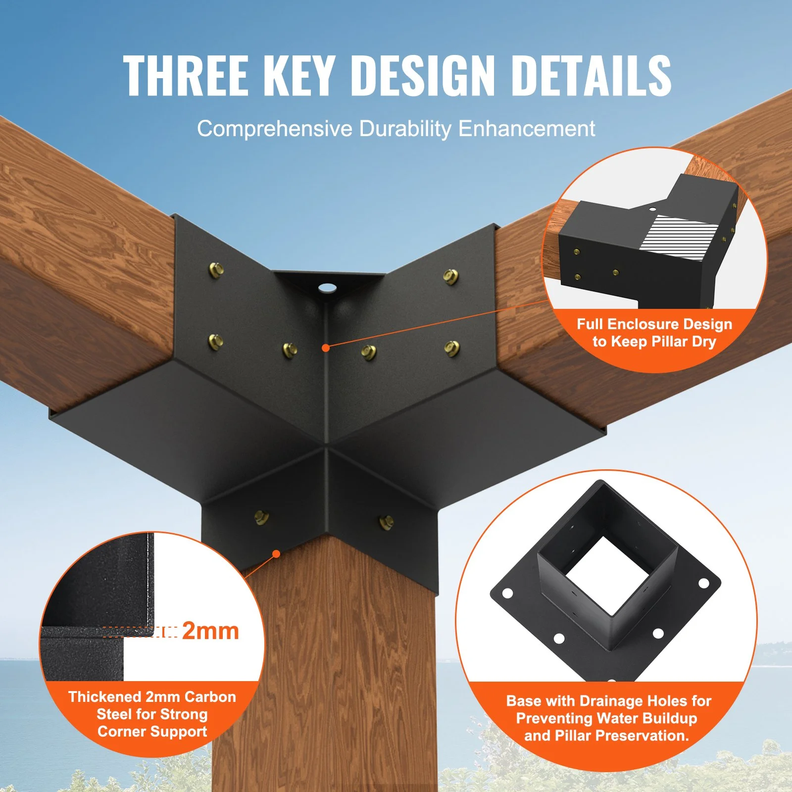 This durable and strong pergola bracket kit that covers wooden beams, preventing them from rotting due to rainwater and harsh sunlight. It is designed for the mainstream 4" x 4" specifications and can accommodate actual dimensions of 3.6 x 3.6 inches (92 x 92 mm) for both soft and hardwood.