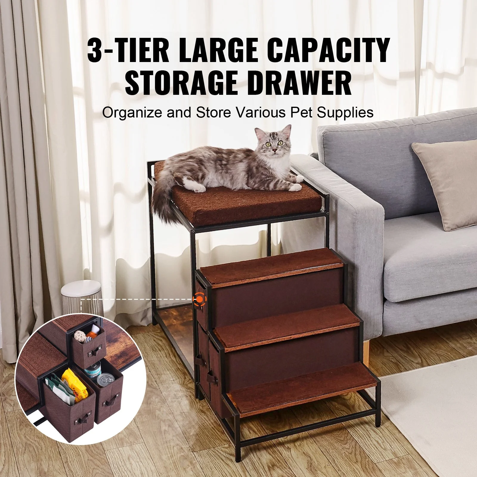 Utilizing the space underneath the stairs, 3 large-capacity storage drawers are set up, which can conveniently store some pet supplies such as food, canned food, toys, quilts and other items.