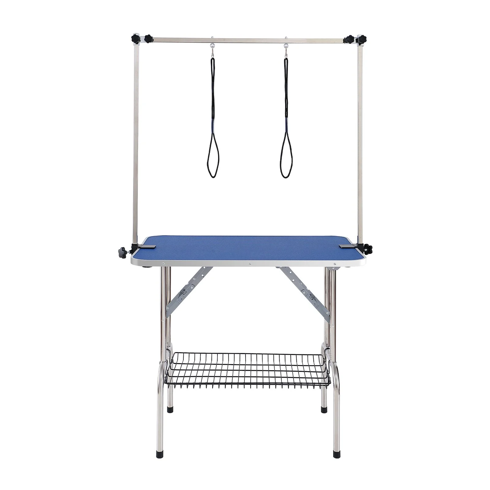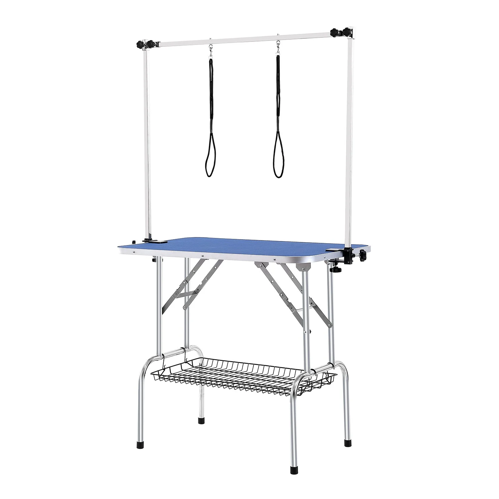 Installing this pet grooming table is quick and straightforward, with just 4 steps: Step 1 - unfold the grooming table and place it level; Step 2 - securely clamp the 2 iron fixtures onto the table; Step 3 - attach the H-shaped double arms; Step 4 - finally, install the storage shelf.