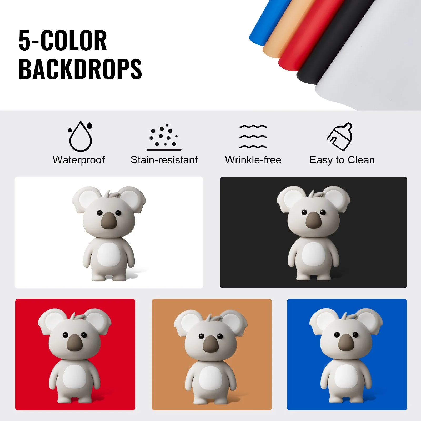 Diversify your creative setup with our set of 5 detachable waterproof PP backdrops (black/white/orange/red/blue). Easy to swap, clean, and wrinkle-resistant, these backdrops allow you to freely choose backgrounds that suit your themes perfectly.
