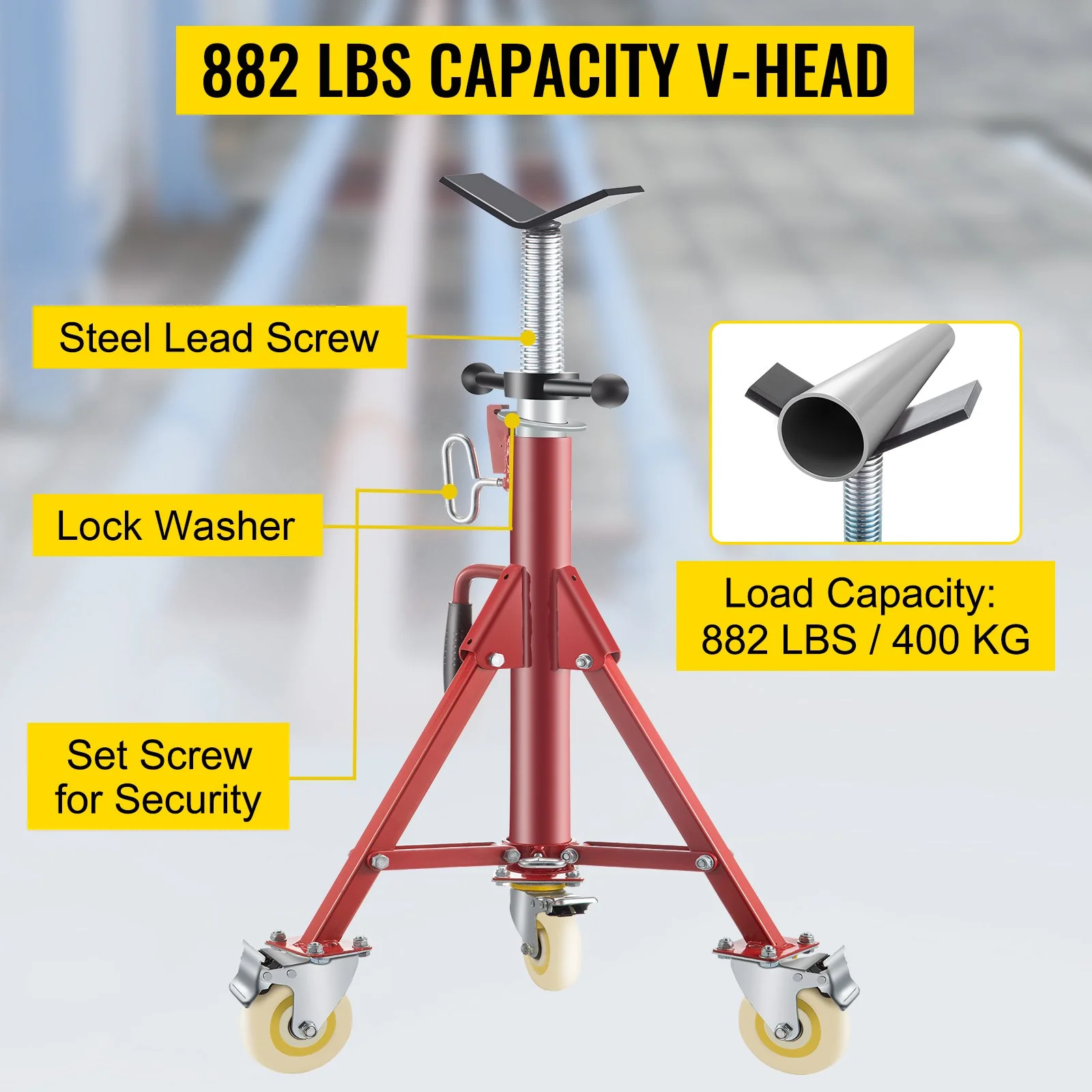 HEAVY DUTY V-HEAD- The pipe stand is constructed of premium steel, rust- and corrosion-proof, durable for a long time. The lock washer ensures security and large capacity. Max lifting weight can reach up to 882lbs / 400 kg.