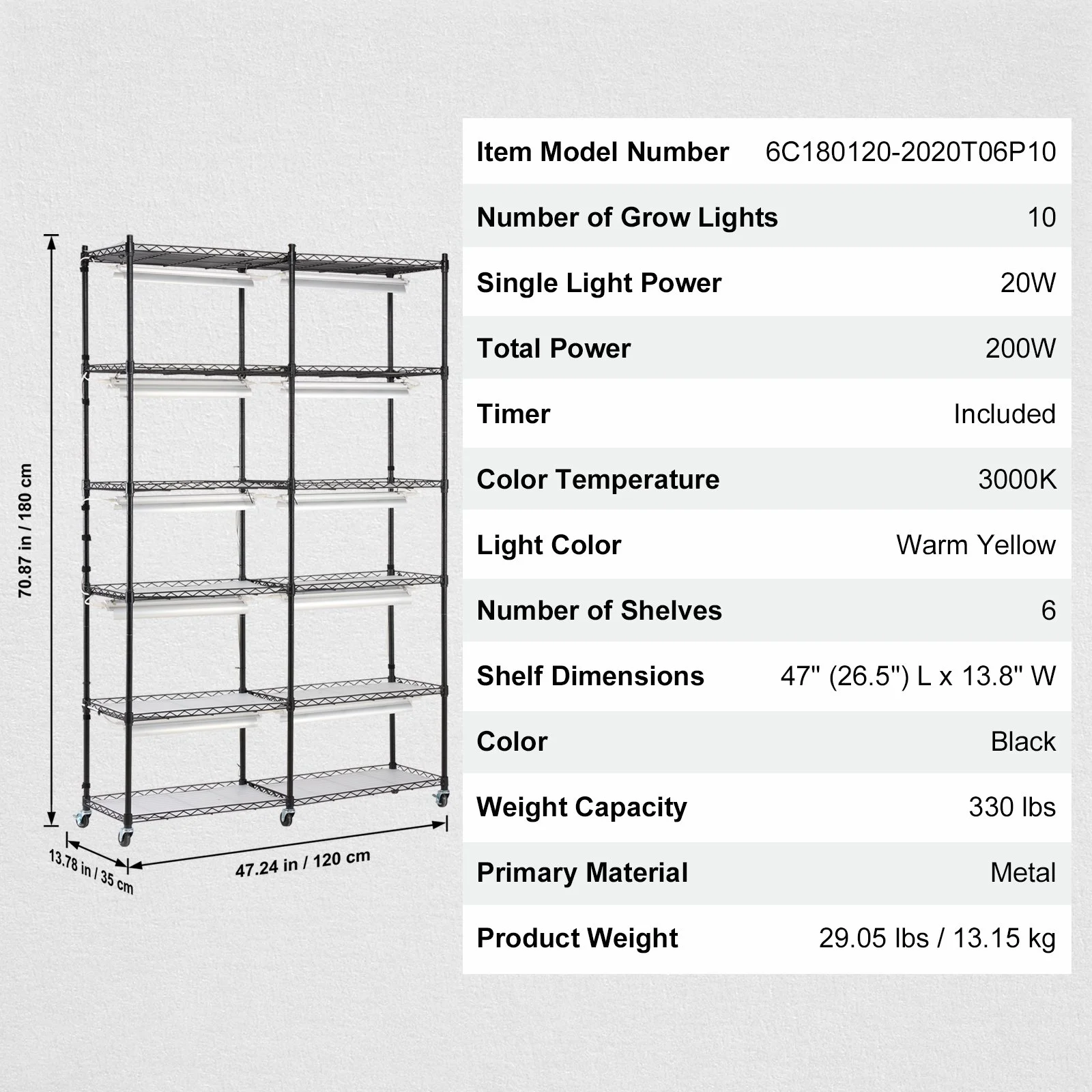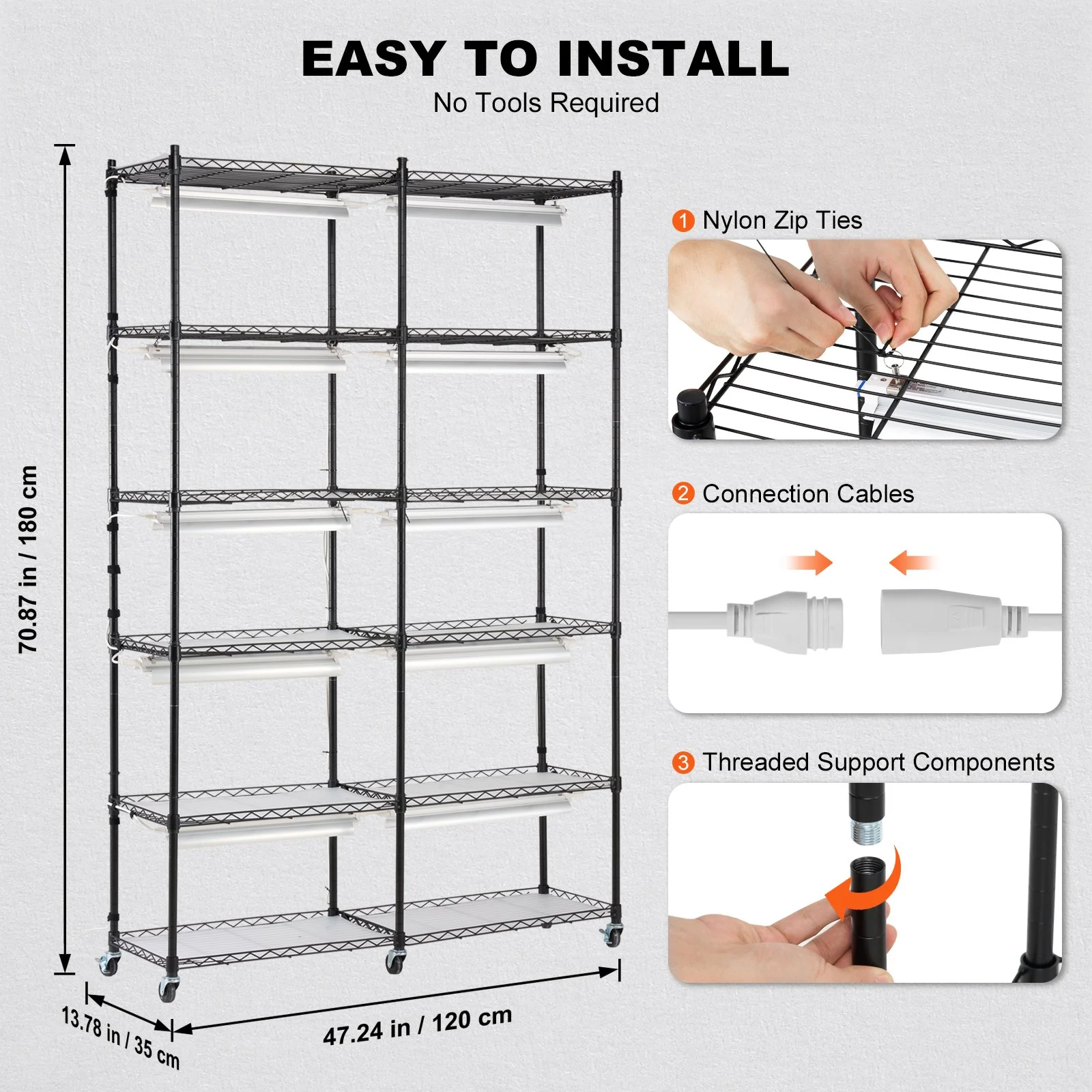 This high-density steel plant shelf with grow light boasts excellent rust and oxidation resistance, with dimensions of 47.2 x 13.8 x 70.1 in, and features 6 shelves measuring 47.2 x 13.8 in each. It supports up to 330 lbs, allowing you to vertically display multiple plants in a compact space. Equipped with three adjustable light settings, simply press the controller to start your planting journey.