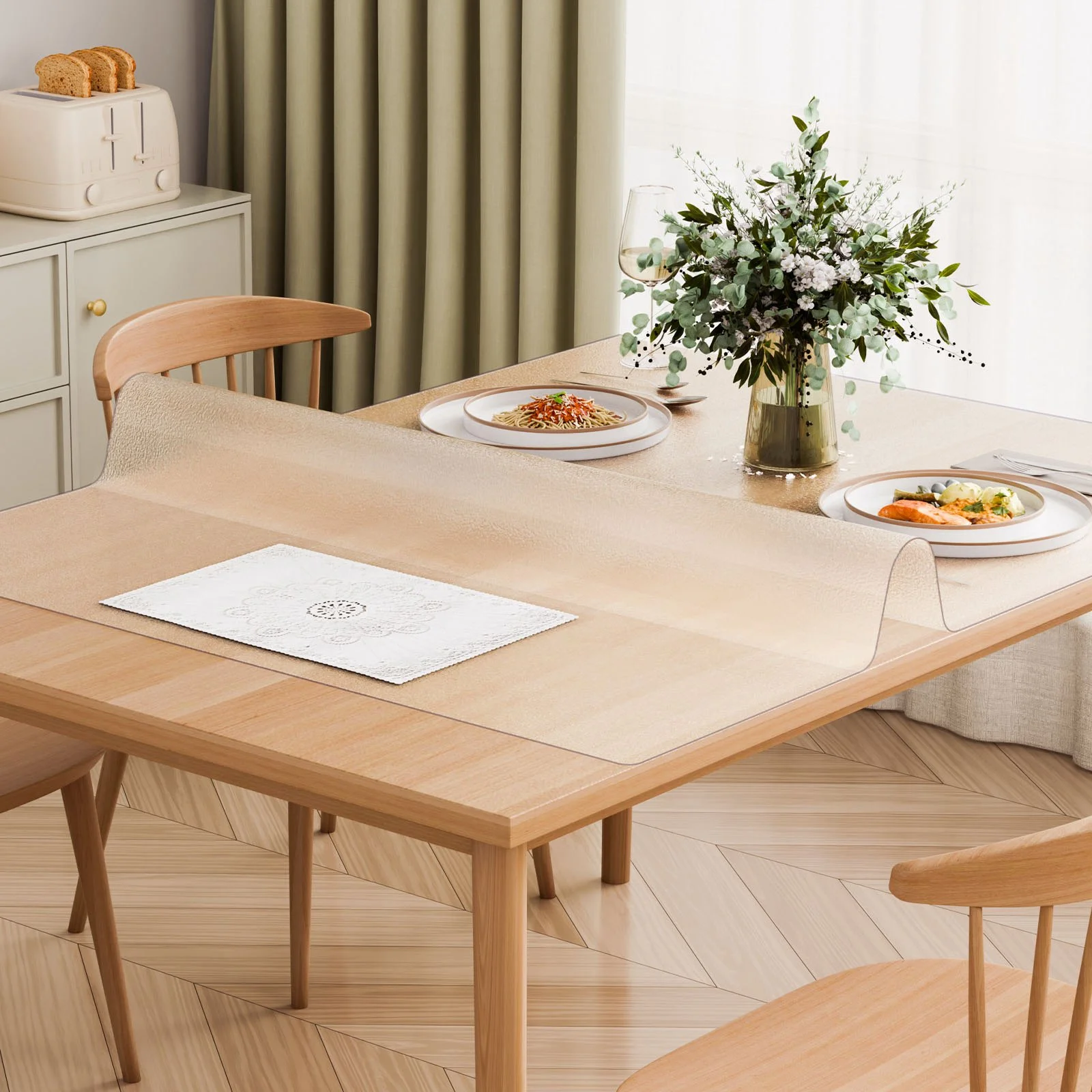 Our clear table cover protector can enhance a variety of environments, including homes, offices, restaurants, and event venues. They are suitable for wooden textured desktops such as dining tables, kitchen countertops, end tables, computer tables, dressers, TV cabinets, and more. Unlock limitless possibilities and enhance your experience!