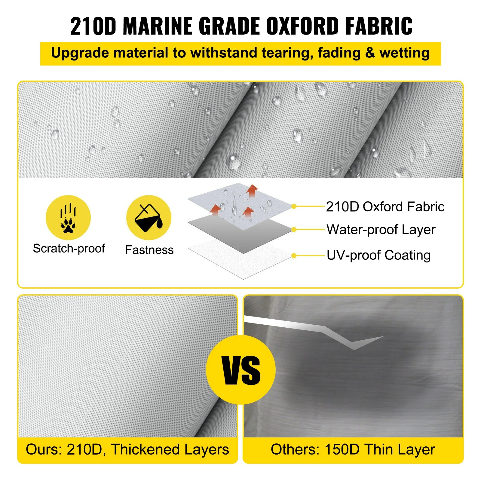 This boat cover is made of marine-grade 600D oxford fabric, making it sun-proof and waterproof. It is not easy to fade and tear. The material is easier to clean, so you don't have to worry about tree sap and dirt settling in.