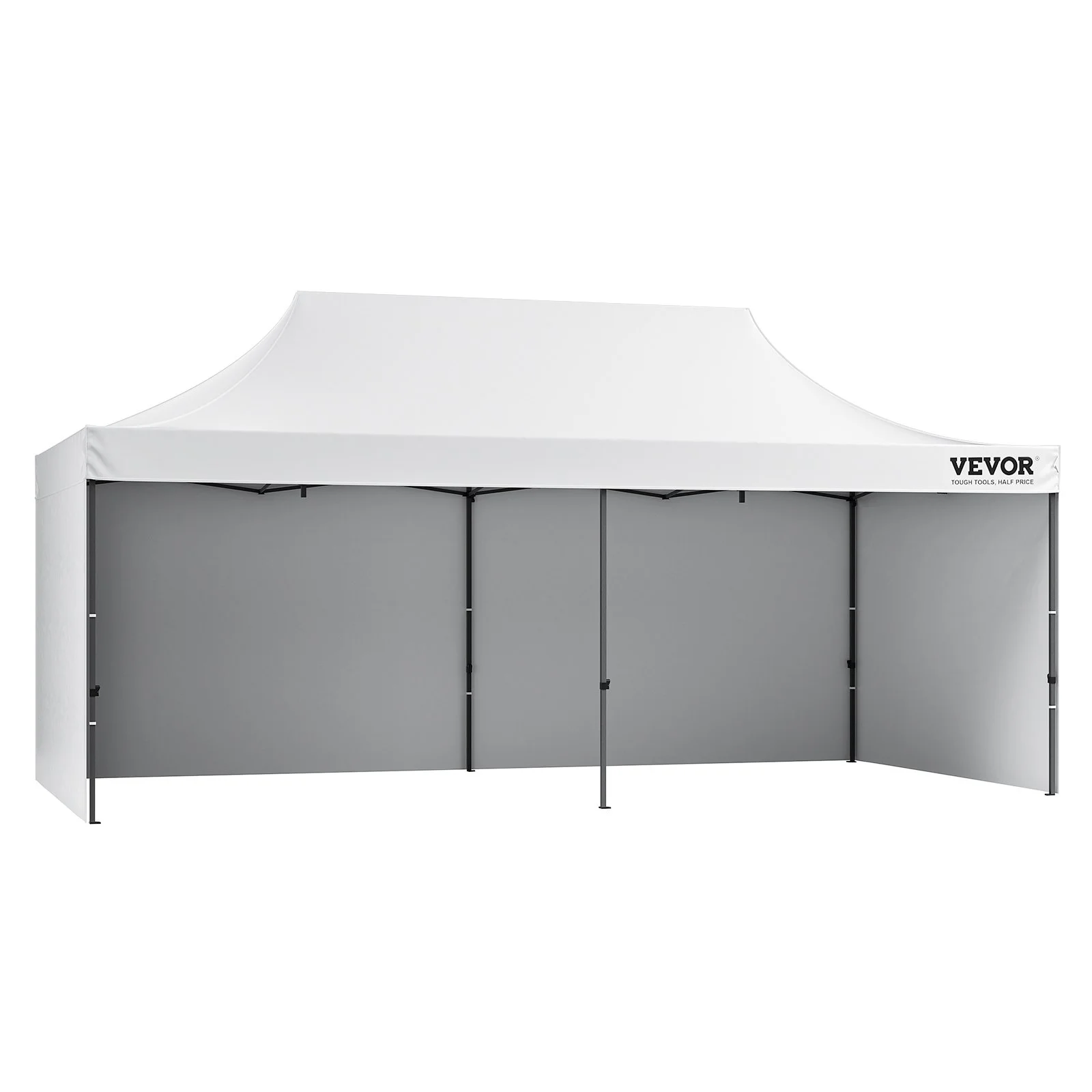 This 10x20 pop up canopy tent can be assembled in one minute, providing a temporary gathering place of 200 square feet. With three adjustable heights and a maximum internal height of over 9 ft, it offers a spacious standing room. This canopy with sidewalls comfortably accommodates 12-16 people, providing sun shade for a comfortable gathering.