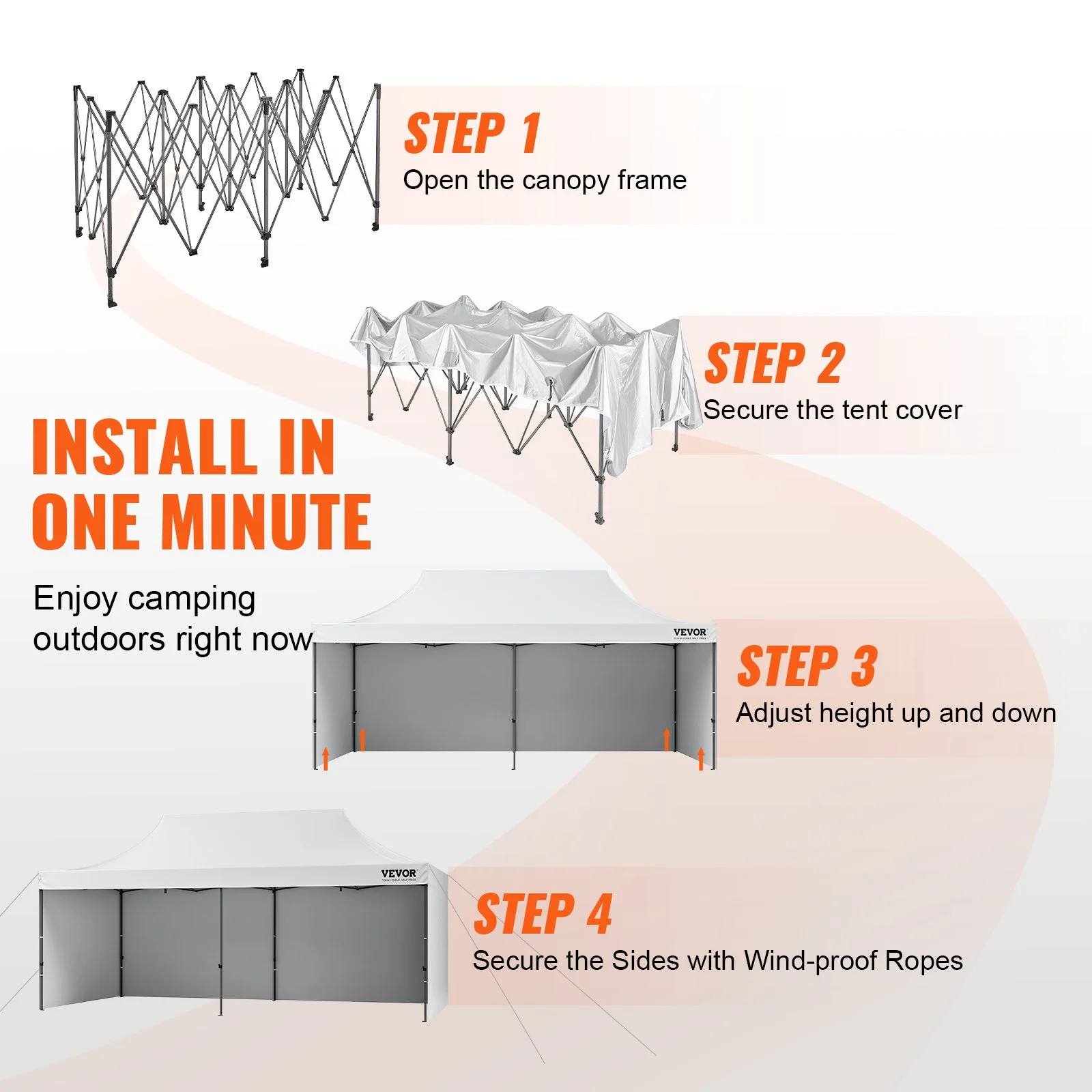The detachable sidewalls are connected by seamless velcros, convenient and quick to assemble or disassemble. You can easily remove or install sidewalls, providing a well-ventilated space on hot summer days, or building a stable temporary shelter on windy or rainy days.
