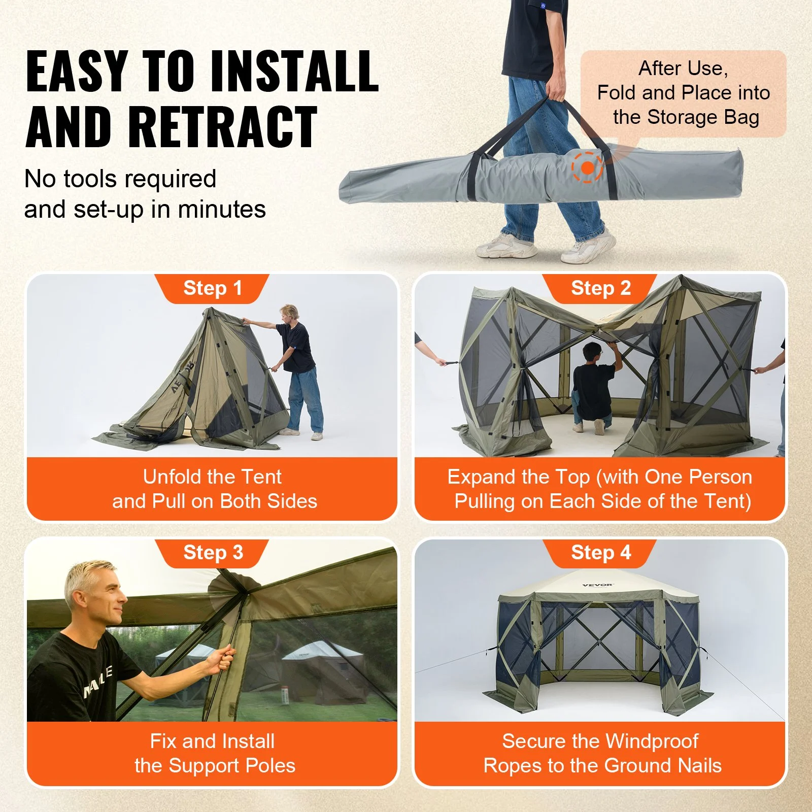 Our camping gazebo tent features thickened 300D Oxford fabric and polyester yarn mesh with UPF50+, effectively blocking 99% of UV rays and insect intrusion. With its superior sunshade and waterproof capabilities, it offers a comfortable resting space for outdoor gatherings and camping.