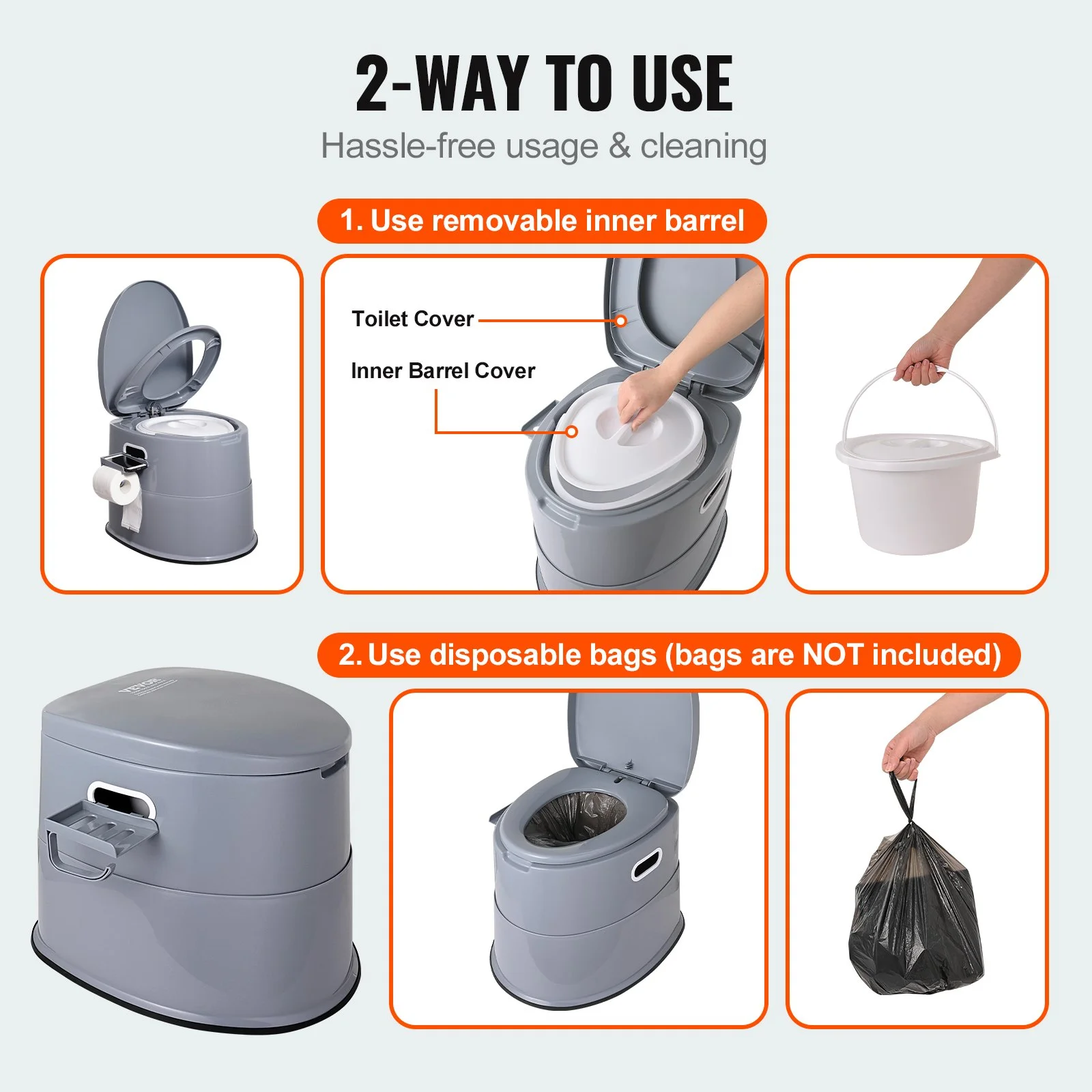 The inner bucket, toilet seat, and lid of the outdoor toilet are all removable, simplifying cleaning. Just remove the bag containing waste to dispose of it. The inner and outer lids are designed to seal effectively, reducing odors and keeping the air fresh.