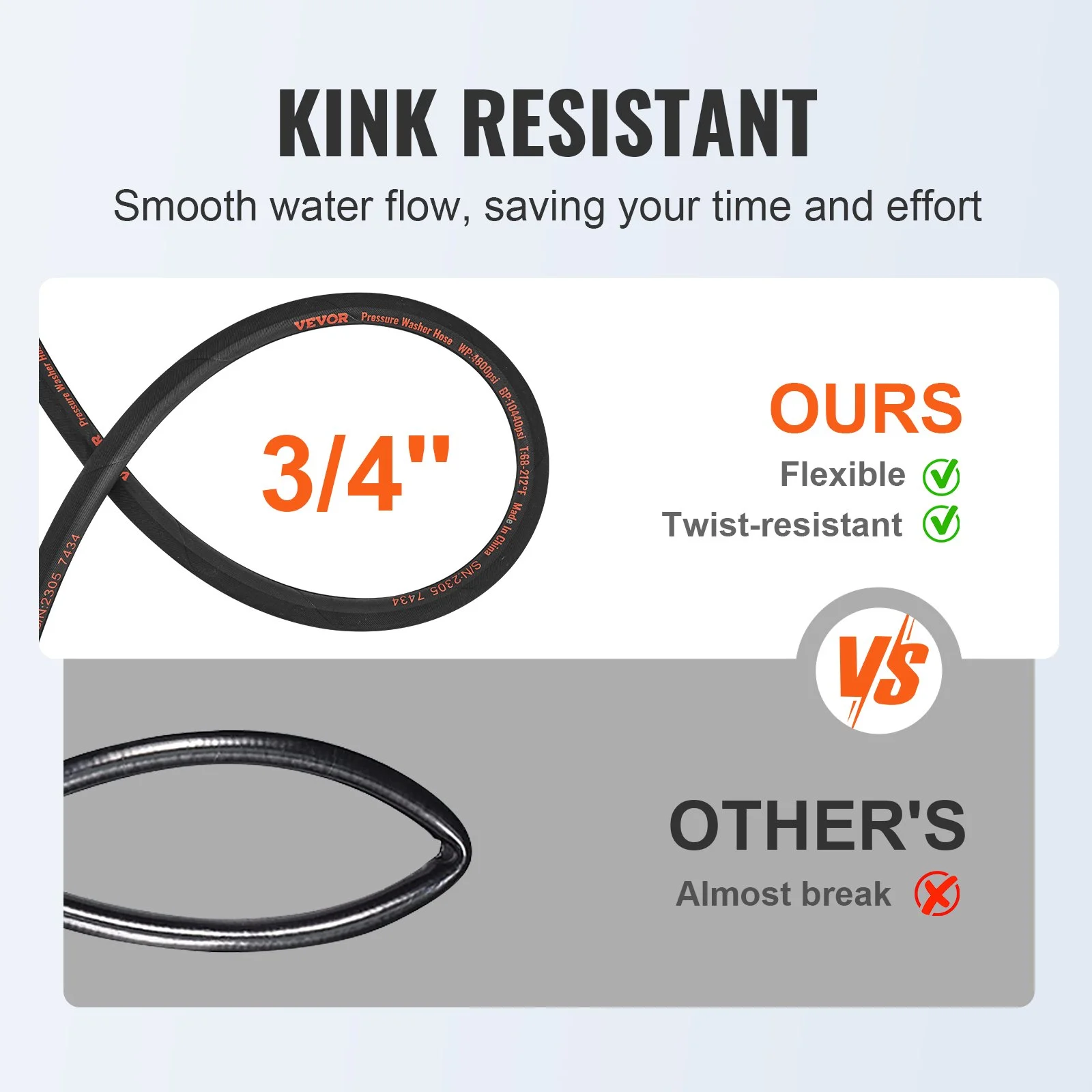 The hose has a bend radius of 4.9 inches, making it easy to stretch, roll up, and carry. Its high flexibility eliminates the need to frequently loosen the hose to restore water flow, allowing for more efficient cleaning without interruptions.