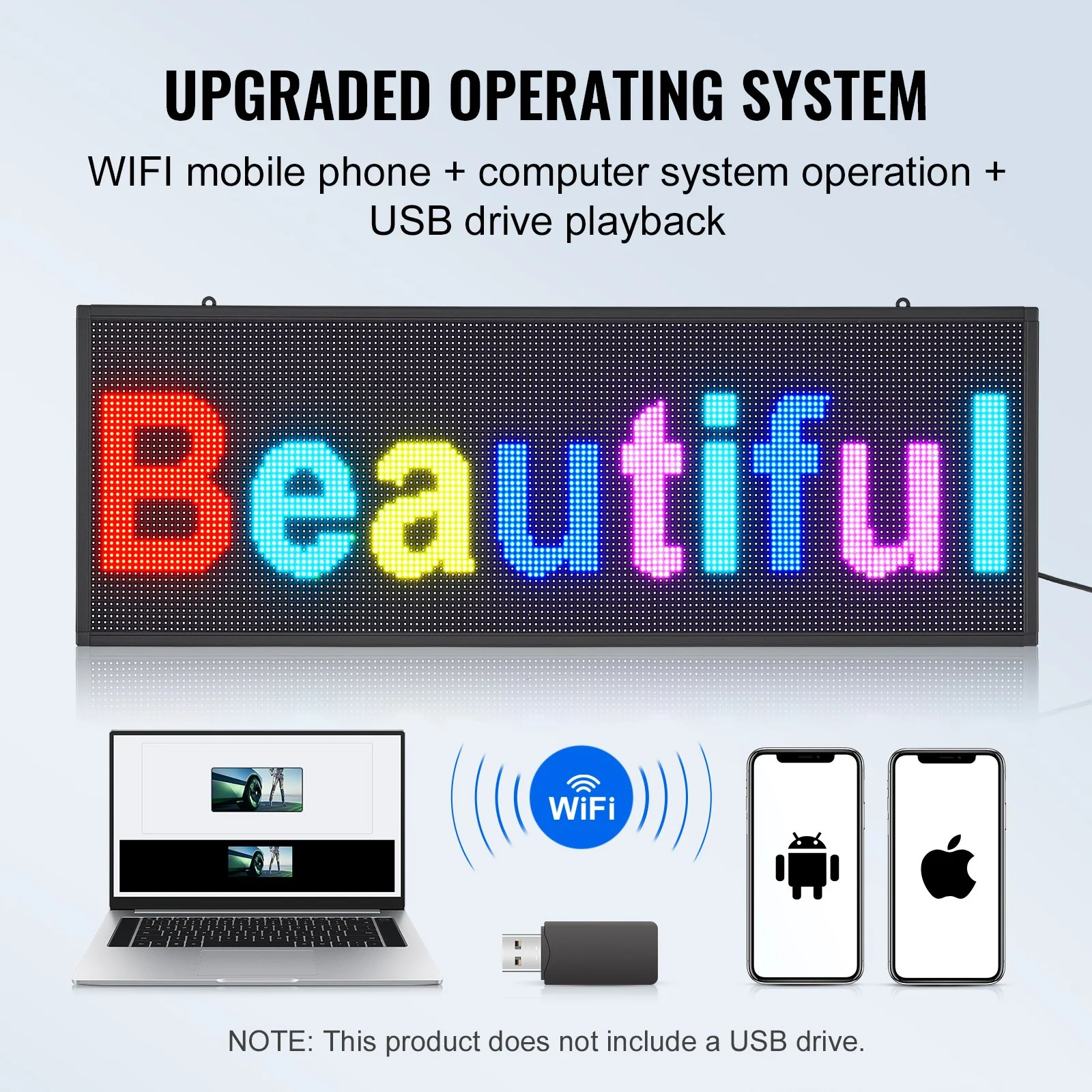 The scrolling led sign is simple to operate, just connect to a Windows computer and phone's WiFi (computer support is limited to Windows, while both Android and Apple phones are compatible) and use the software to freely edit advertising content. The instruction manual includes detailed operating instructions.