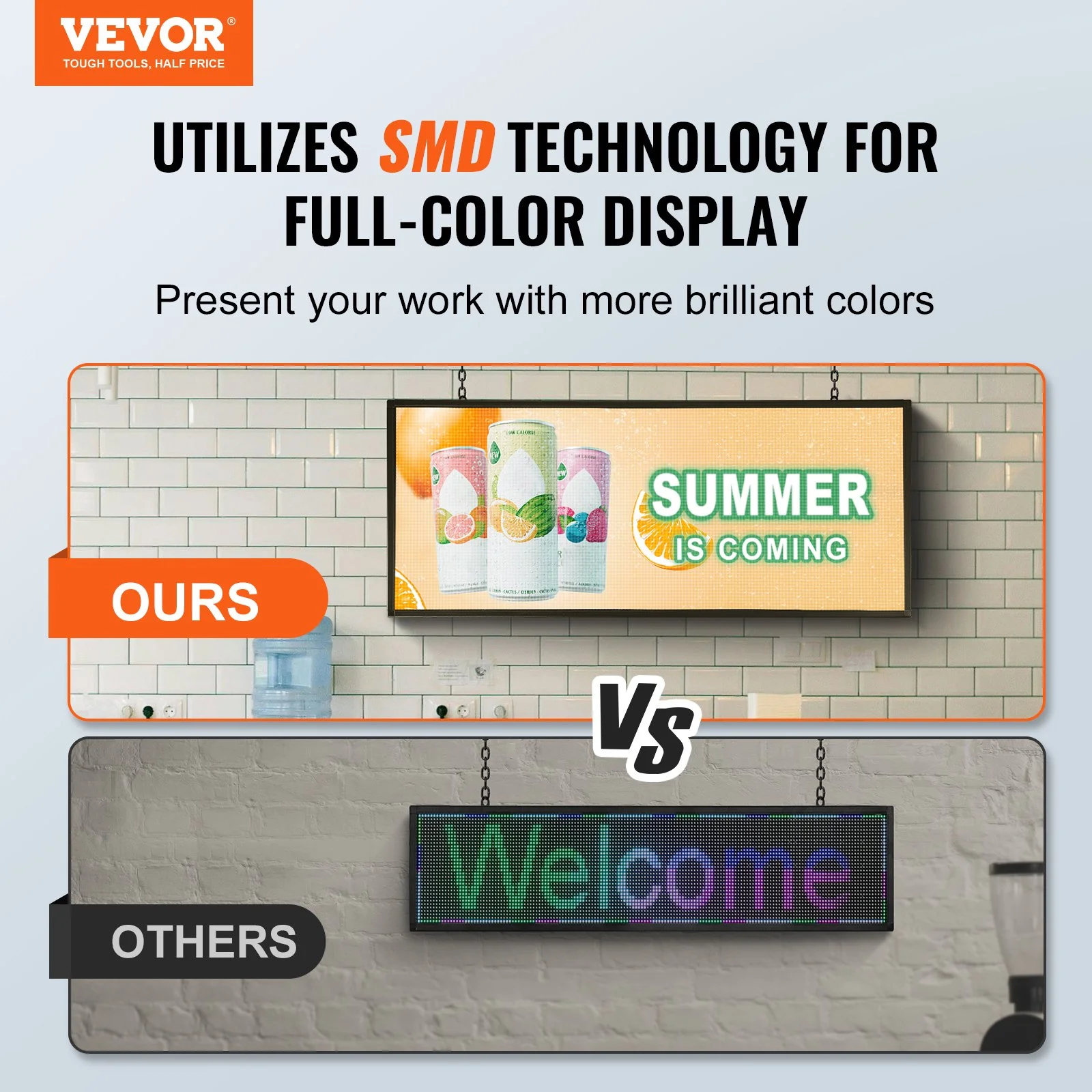This scrolling display board, with two hooks on the top, can be hung on a wall, whether at the top of a house or at the entrance of a shop, easy to install with nuts.