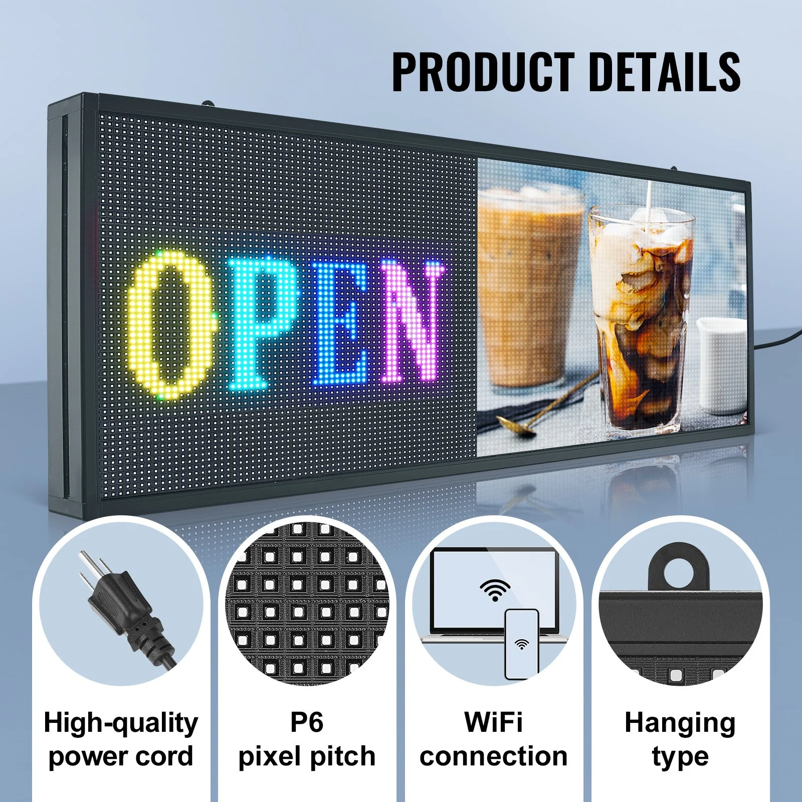 The programmable led sign features a full-color LED sign using SMD technology, with high-quality beads that make your displays pop. With a pixel pitch of P6 and a display resolution of 64x160 pixels, it enhances your visibility in malls, supermarkets, and storefronts across various commercial settings, visible from a distance. Enhanced power supply quality provides stable power to prevent malfunctioning after some time and avoids instability in LED lights due to insufficient power supply.