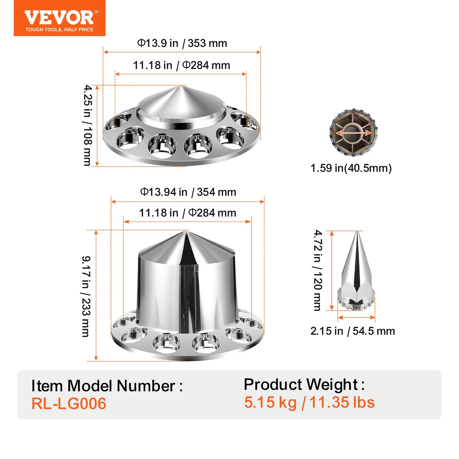 The complete axle cover combo kit fits various rim sizes, including 10-hole 20in, 22.5in, and 24.5in rims. This ensures easy installation regardless of your semi-truck model.