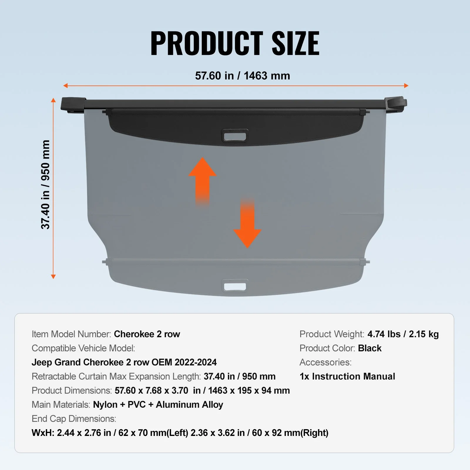 This retractable cargo cover is suitable for the original Jeep Grand Cherokee 2 Row 2022-2024. Please verify your vehicle's model year before purchasing. This cover is crafted to seamlessly fit the curvature of your vehicle's luggage compartment, ensuring a tidy and organized space.