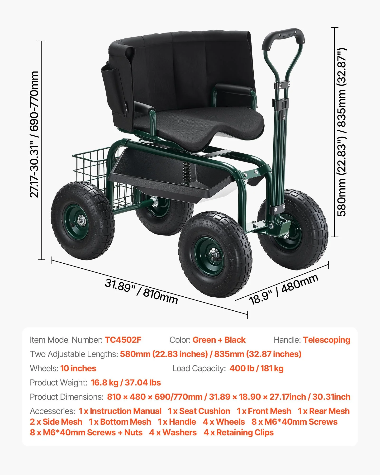 This rolling garden cart with seat features 10-inch inflatable tires that absorb bumps, ensuring a smooth ride on uneven terrain. The adjustable handle (22.83” to 32.87”) makes it easy to pull around your yard, saving you effort while providing ease of use.