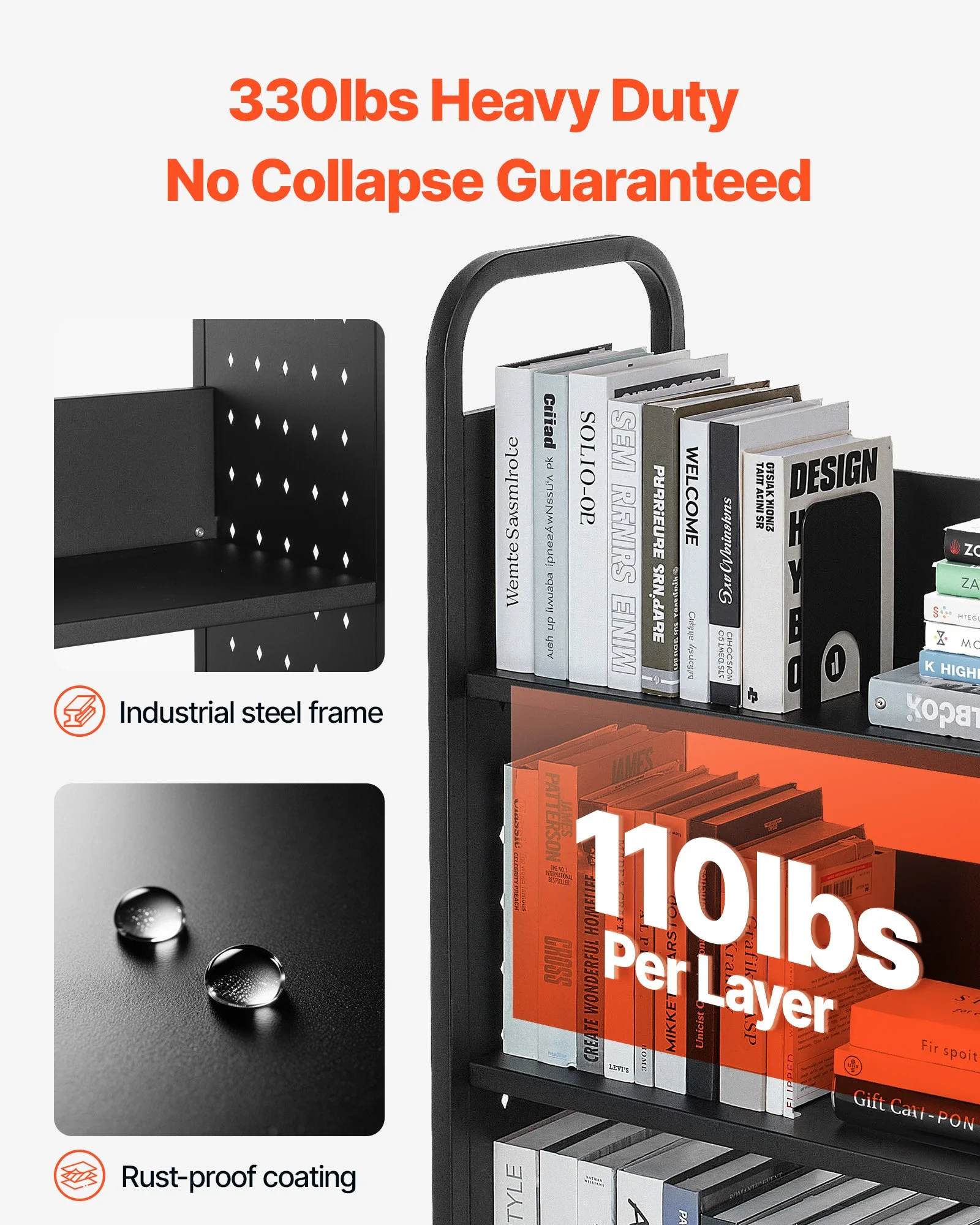 Made of high-strength carbon steel, each layer of the rolling book cart supports 110 lbs (50 kg), with a total capacity of 330 lbs (150 kg). The rust-resistant coating ensures durability, ideal for heavy books or equipment