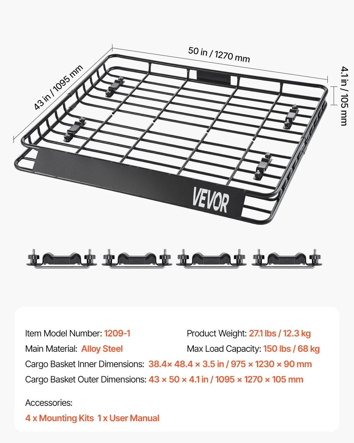 The 43 x 50 in roof rack cargo carrier supports up to 150 lbs, providing extra loading capacity for your vehicle’s roof. It’s ideal for carrying luggage, sports equipment, camping gear, and more