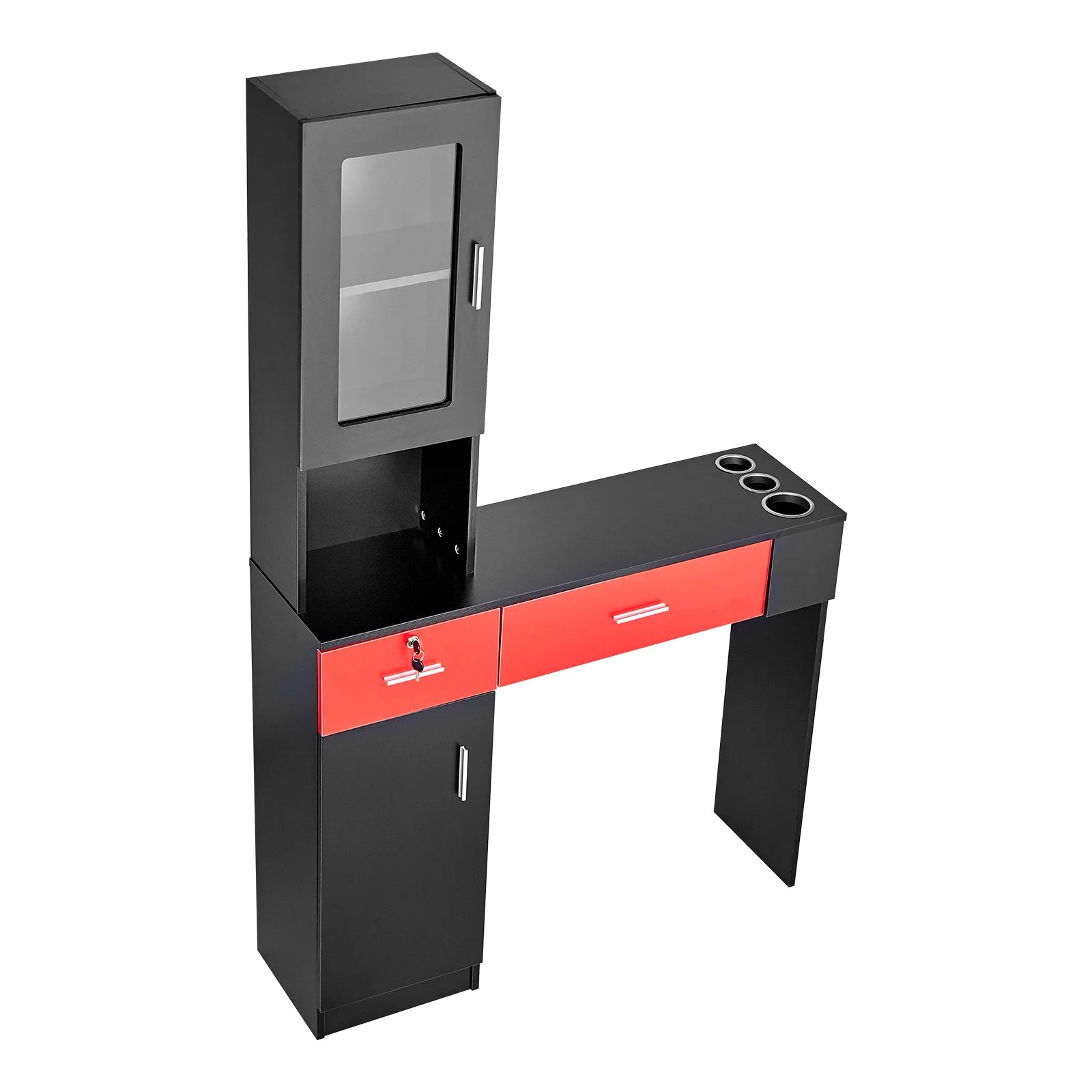 The glass cabinet door design prevents dust and get wet, maintaining cleanliness and enhancing overall aesthetics. Barber hair styling station is equipped with a lockable drawer for storing valuables securely.