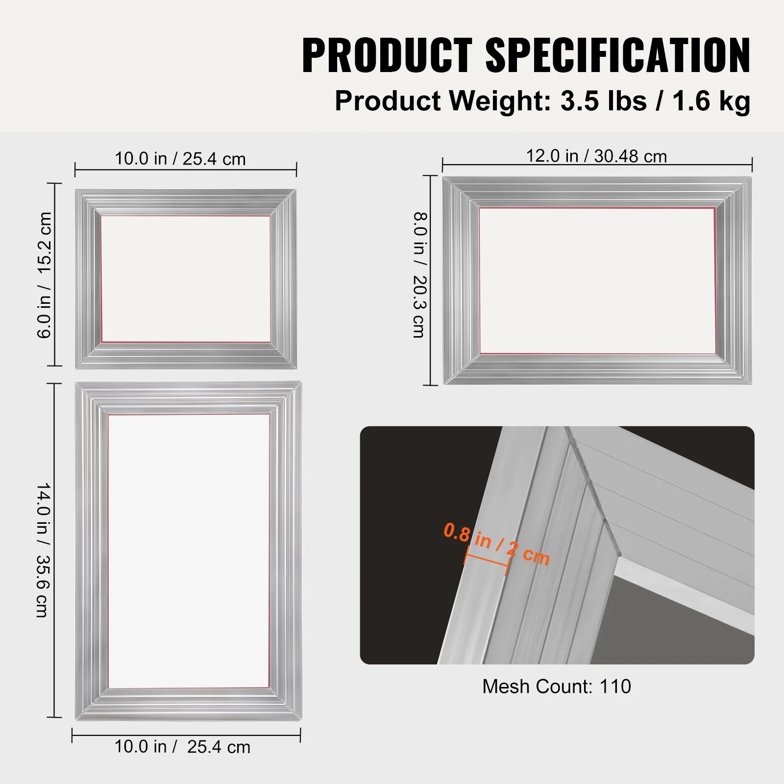 The set consists of 3 different sizes of 110 mesh aluminum screens, 1 screen sgueegee, 2 plastic scrapers, 5pcs A4 ink-jet transparent films, 10 sticks, 1 roll of silver tape, 1 roll of making tape, 5 pairs of gloves, 1 measuring cup, 10 plastic cups, and 5 packs of fine glitter. Buy everything you need at one time.