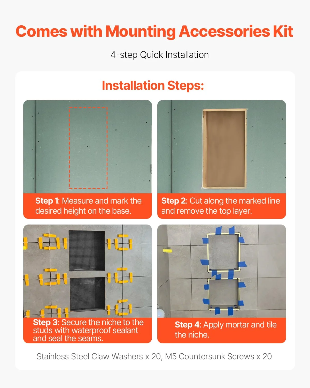 Comes with an accessory kit for horizontal or vertical recessed installation. Just follow these steps: Step 1: Determine the required height and draw a horizontal line on the base layer. Step 2: Cut along the line and get rid of the top base layer. Step 3: Use waterproof sealant to attach the niche to the studs and seal the joints. Step 4: Apply mortar and affix chosen tiles.